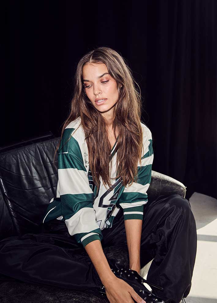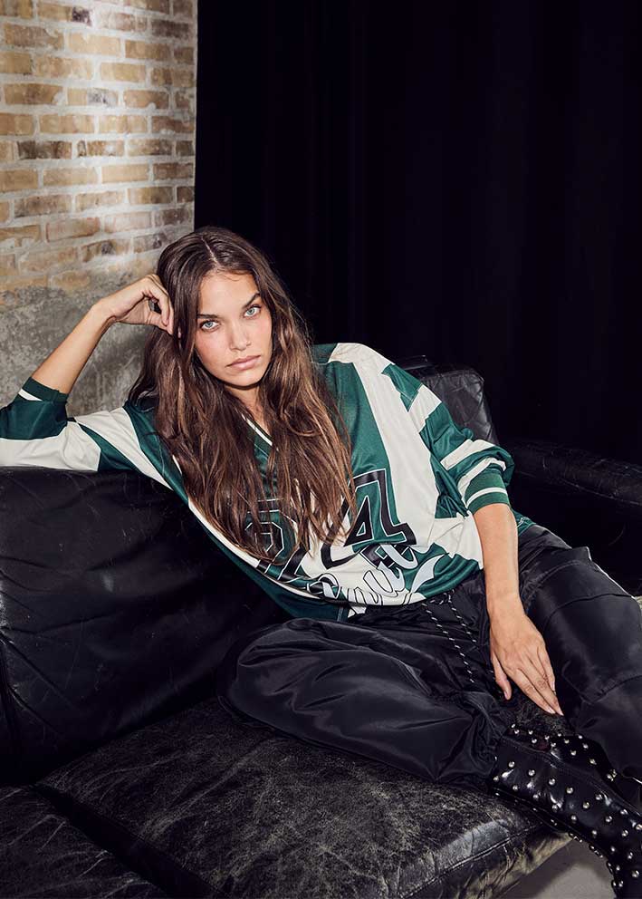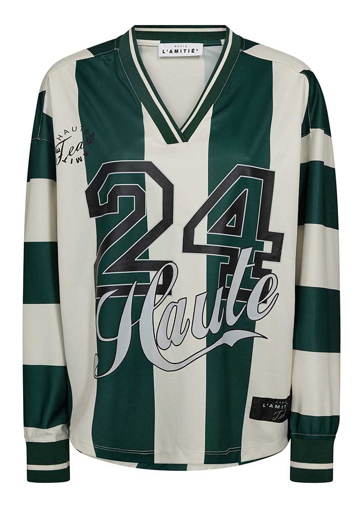 Super cool grøn/creme-stribet Haute 24 Stripe bluse fra Haute L'amitié, designet i en lækker kvalitet med stort 24 og logoprint på brystet. Blusen er oversized med v-hals, lange ærmer og et super cool udtryk.