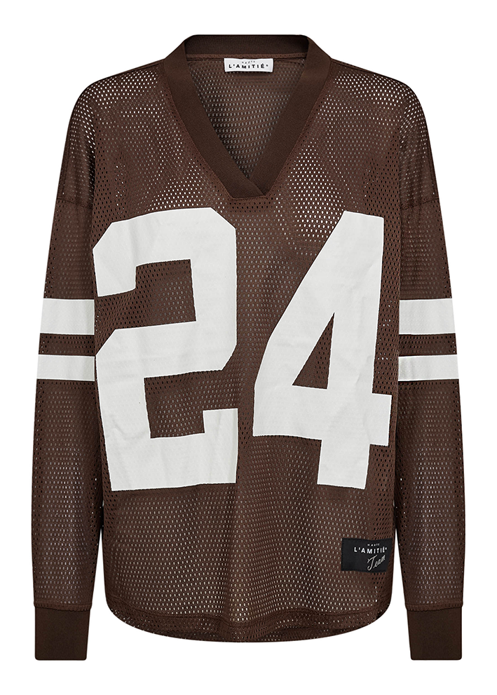 Super cool mørkebrun Drift Number t-shirt fra Haute L'amitié, designet i en fin meshkvalitet med store tal på brystet og striber på ærmerne. T-shirten er oversized med v-hals og lange ærmer og et cool udtryk..