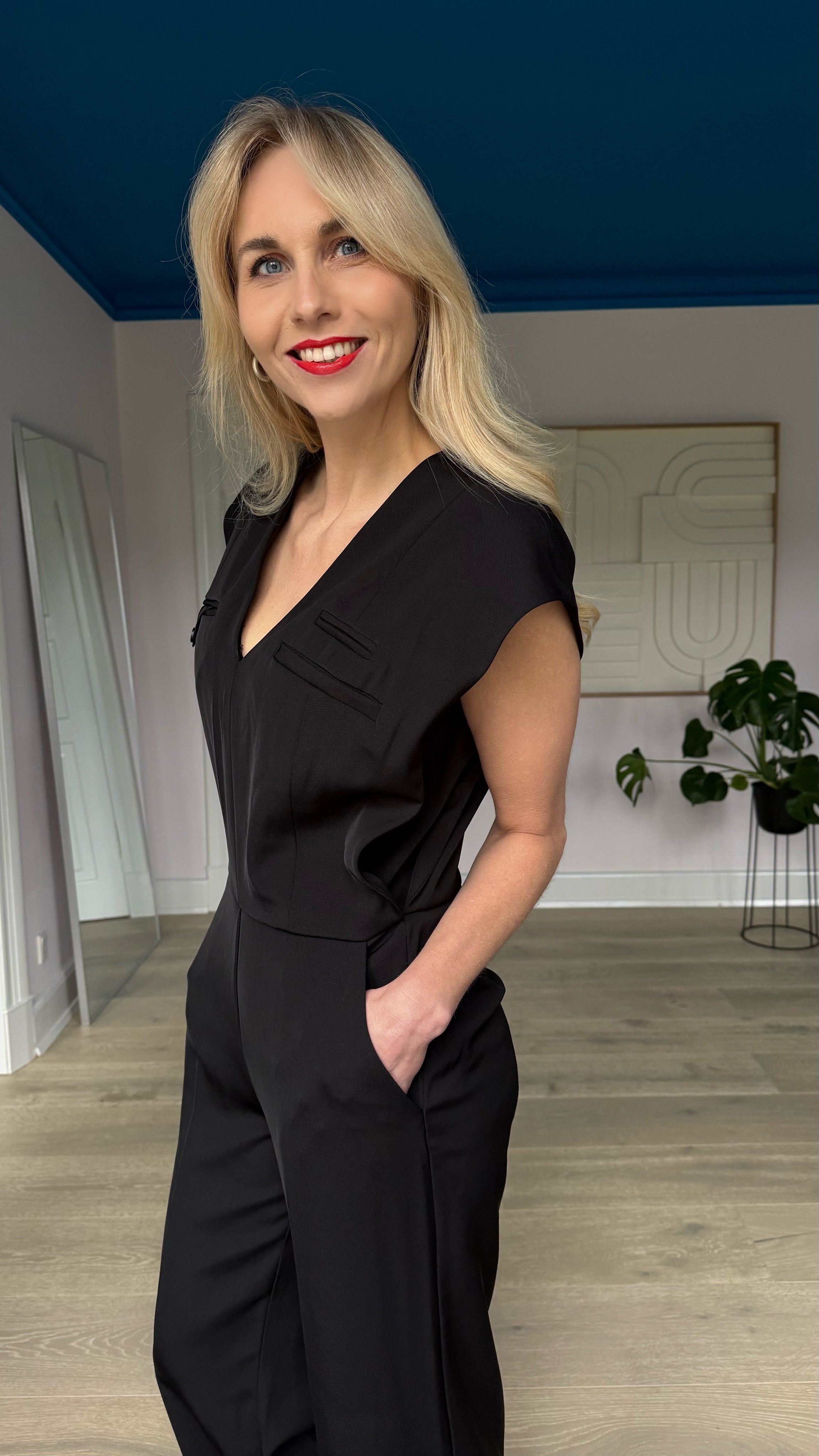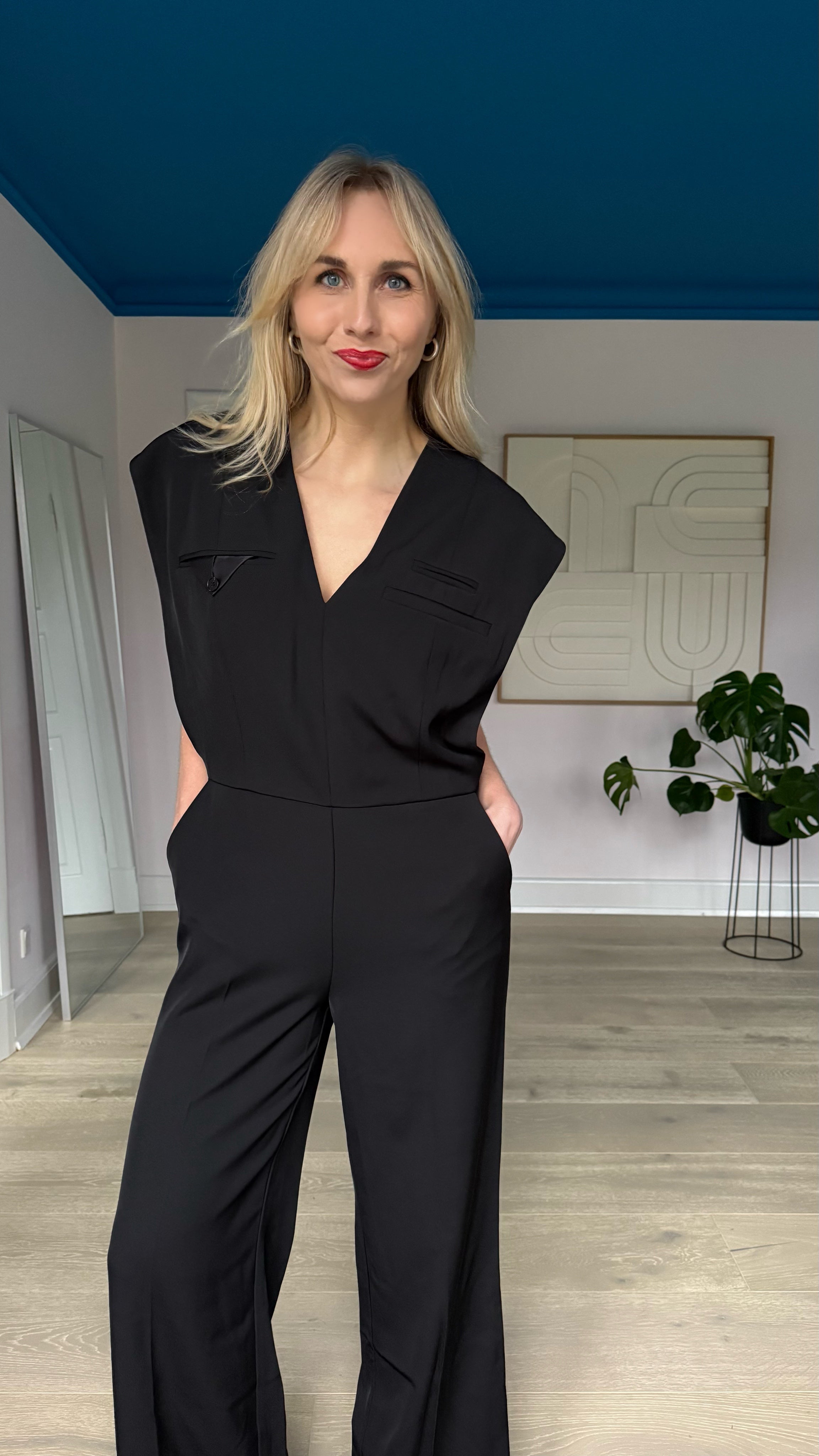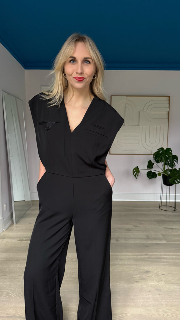 Smuk og elegant sort Jazzy jumpsuit fra Haute L'amitié, designet i en eksklusiv kvalitet med let stræk. Buksedragten er løstsiddende, let figursyet, har v-hals og tre paspolerede brystlommer, hvor den ene er med flap og knap samt stiklommer i siden og lige ben med masser af vidde.