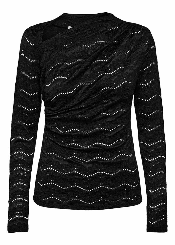 Smuk og meget elegant Lace Drape Neck blondebluse fra Haute L'amitié, designet i et tætsiddende snit med asymmetrisk halsudskæring, lange ærmer og en flot draperet effekt over brystet.
