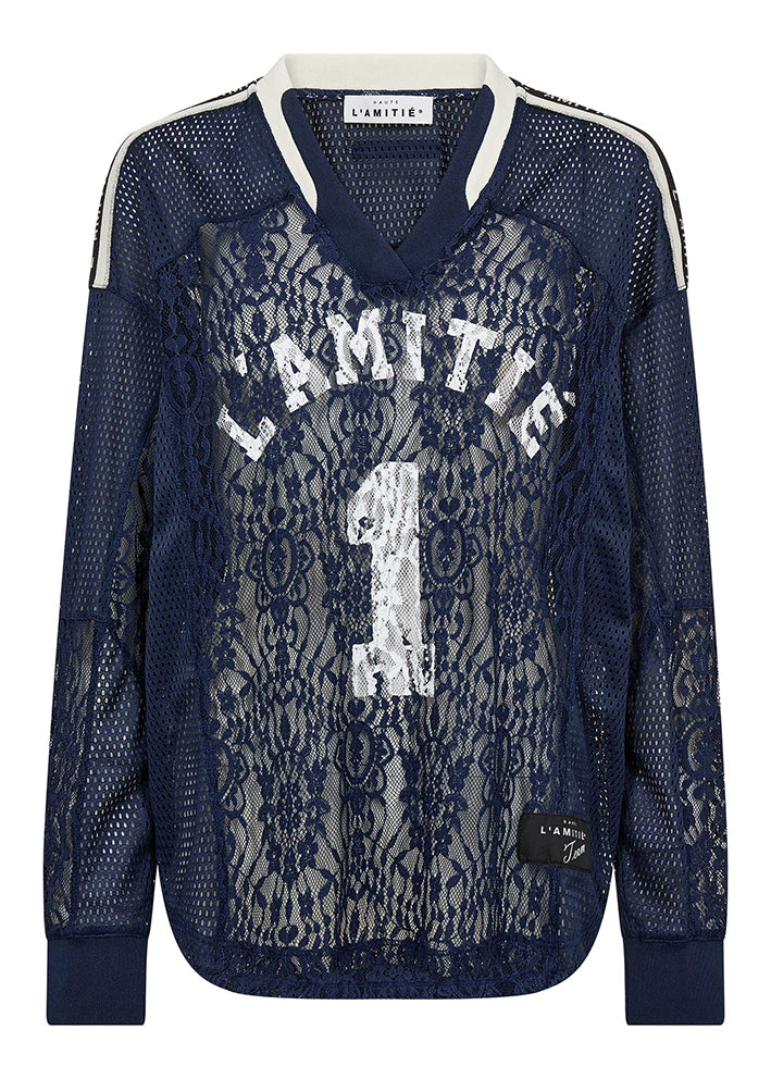 Super fed, sporty og eksklusiv navyblå Lace Football t-shirt fra Haute L'amitié, designet i en elegant stil med blonder, der giver et feminint look.
