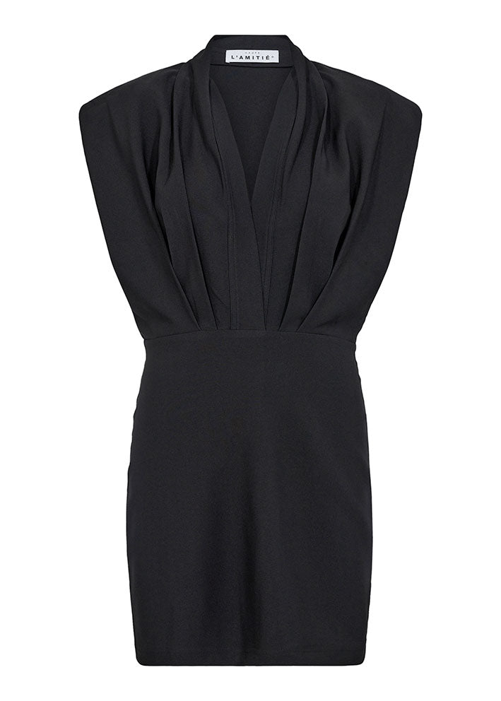 Smuk og elegant sort kjole fra Haute L'amitié, designet i en eksklusiv kvalitet med let stræk. Kjolen har sjalskrave, dyb v-udskæring, læg fra de brede skuldre samt indsnit i taljen, der fremhæver figuren.