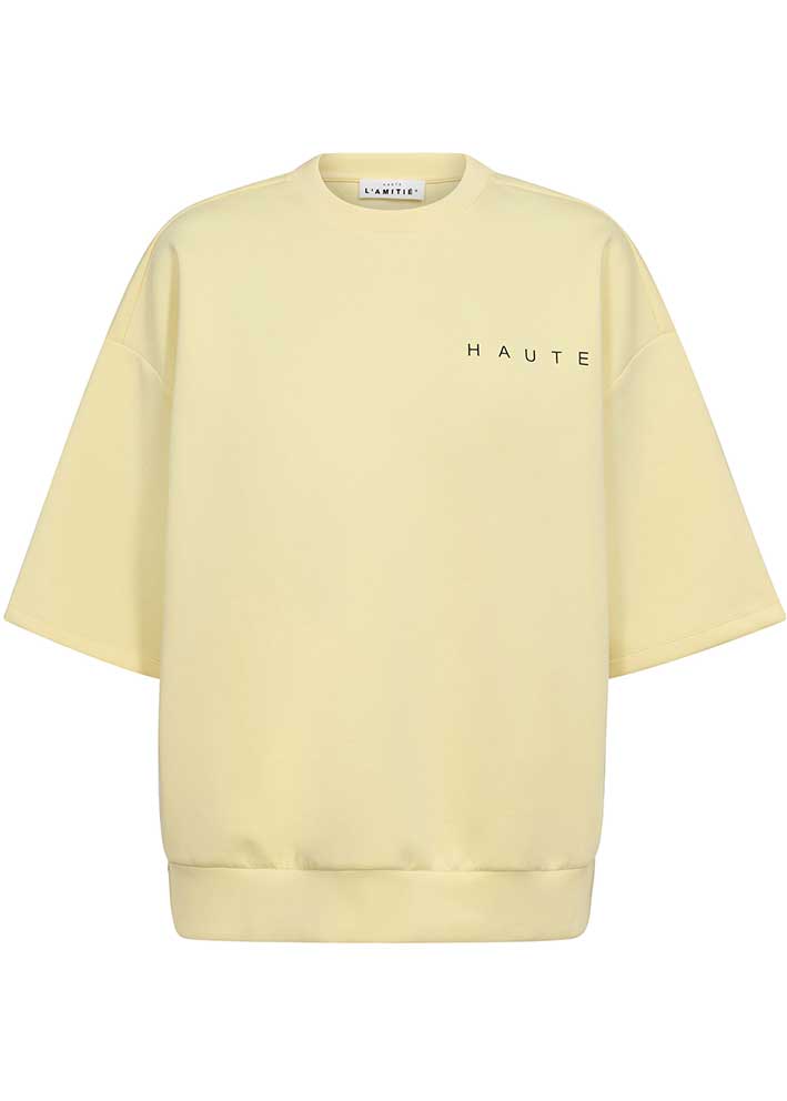 Skøn lysegul kortærmet sweatshirt fra Haute L'Amitié, designet i et enkelt klassisk snit med rund hals, lave skuldersømme og halvlange ærmer.