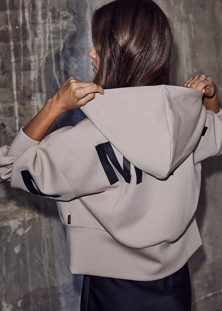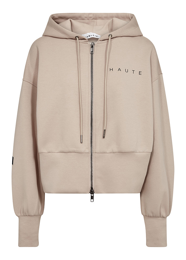 Super lækker beigefarvet hoodie cardigan fra Haute L'Amitie, designet i et friskt snit med hætte med bindebånd, tovejs-lynlåslukning, lave skuldersømme og lange ærmer. Hættetrøjen har logoprint på brystet og store logobogstaver henover ryggen og på ærmerne, der giver et flot grafisk udtryk.