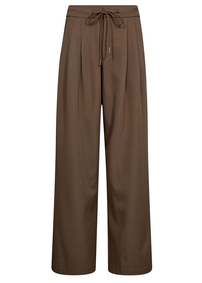 Super cool nøddebrune Michelle bukser fra Haute L'amitié, designet i et klassisk suit snit med høj talje og lige vide ben. Bukserne har en fiks og sporty detalje med bindebånd i livet, hvilket gør dem super anvendelige, både til festlige begivenheder og til hverdag.