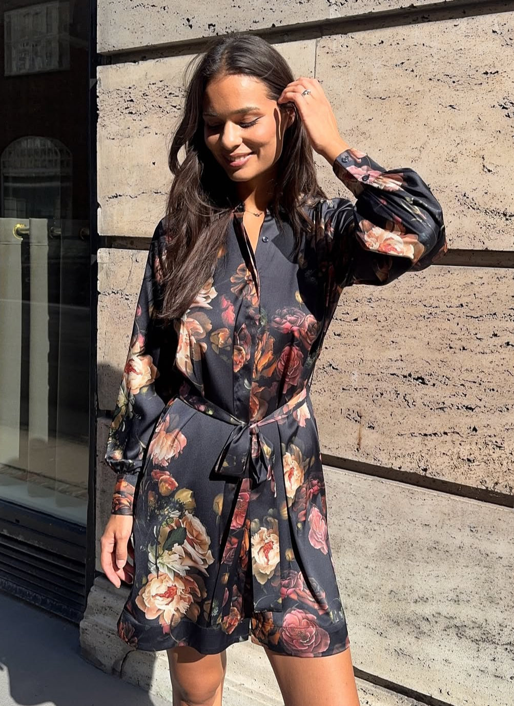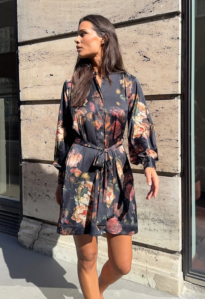 Kjolen har lange ærmer med manchet, lille kinakrave og kan bæres både med- og uden bindebælte.