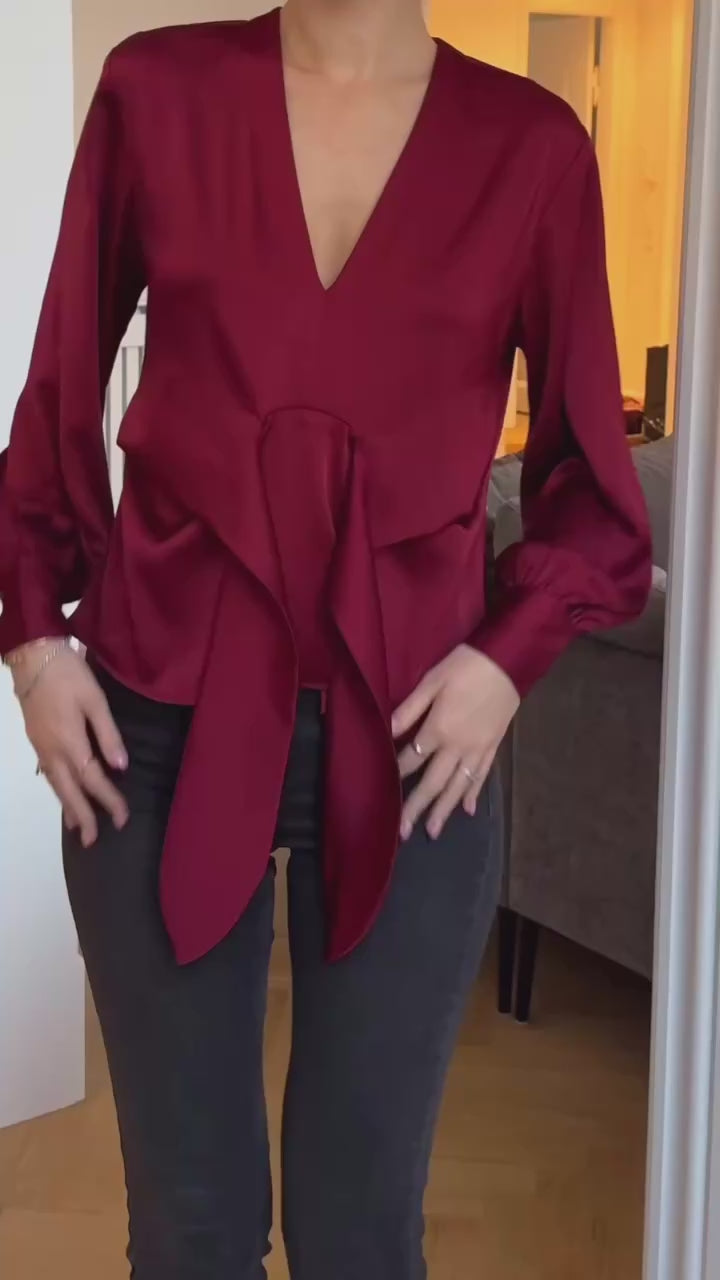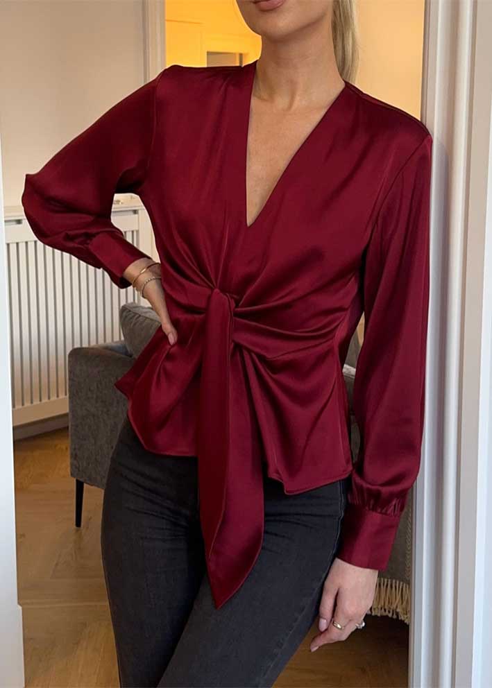 Blusen har lange ærmer med manchetter, v-udskæring og en klædelig bindeeffekt, så den sidder helt perfekt.