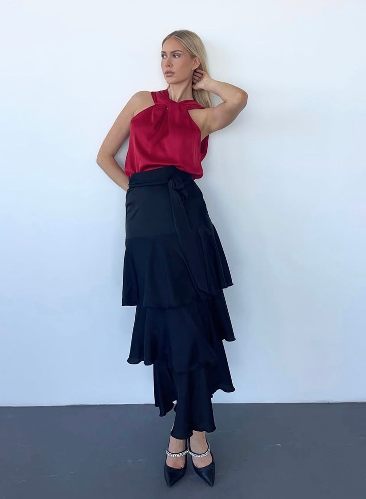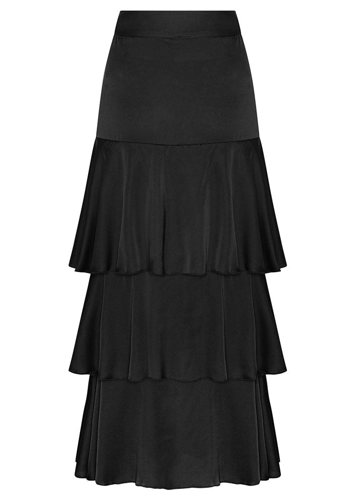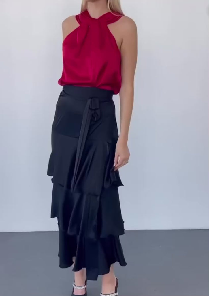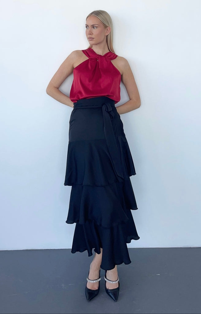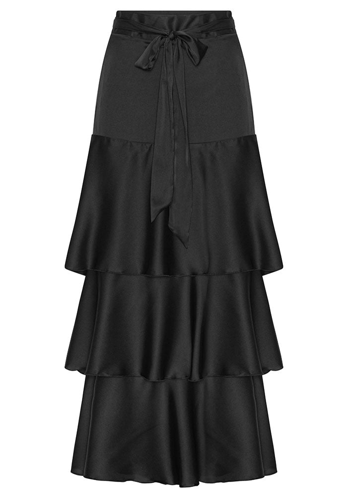 Smuk og elegant sort Celine slå-om-nederdel fra Karmamia, designet i silkeagtigt miljøvenligt polyester, der falder flot, ikke krøller og er super behageligt at have på.