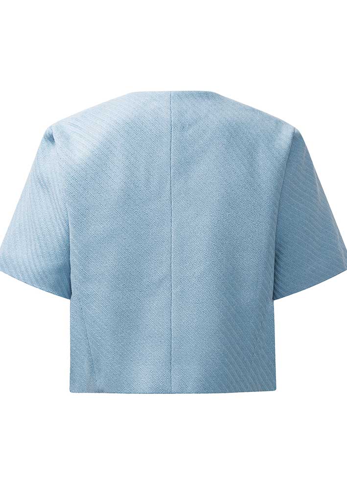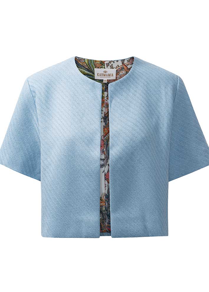 Smuk kort lyseblå Cory jakke fra Karmamia, designet i en let mønstervævet uldkvalitet med flot glitter vævet ind i materialet. Jakken har korte ærmer, rund hals og smukt printet satinfor.