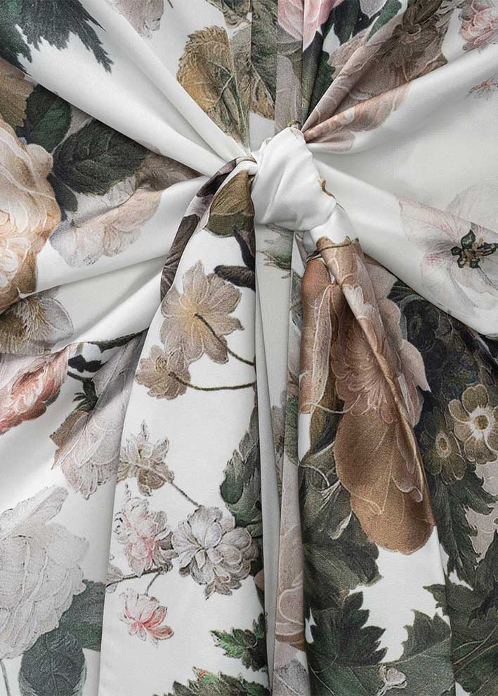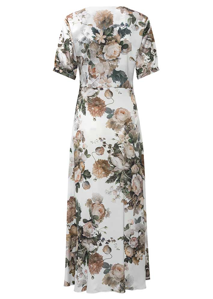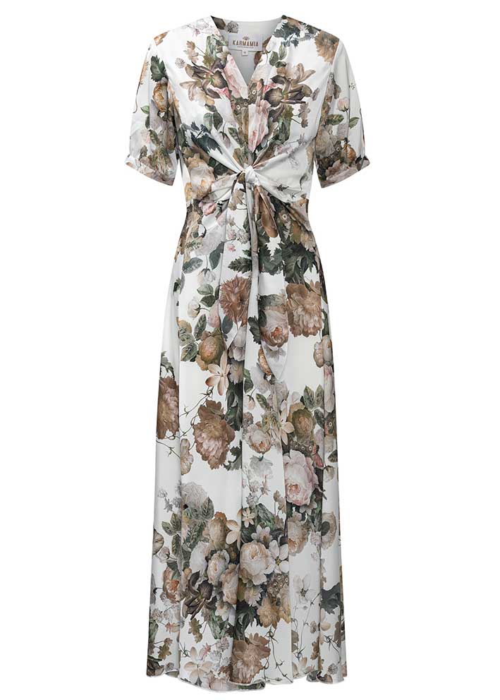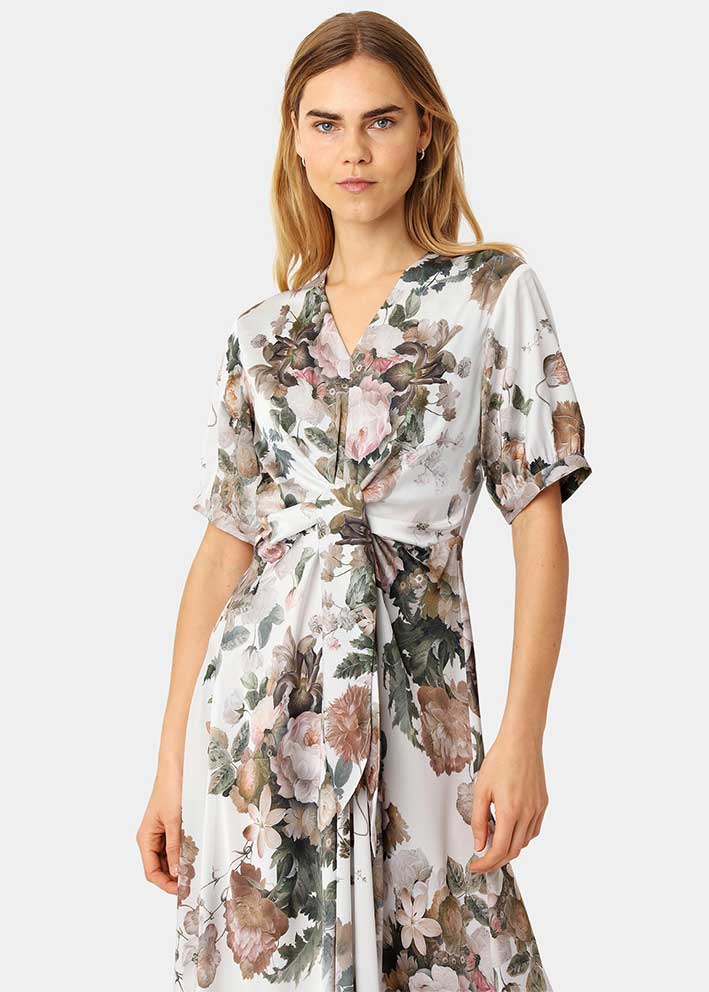 Elegant Faye kjole i det smukke nye print, pale bouquet fra Karmamia, designet i silkeagtigt miljøvenligt polyester, der falder flot, ikke krøller og er super behageligt at have på. Kjolen har korte ærmer, v-udskæring og en elegant bindedetalje fortil, der gør at kjolen sidder helt perfekt.