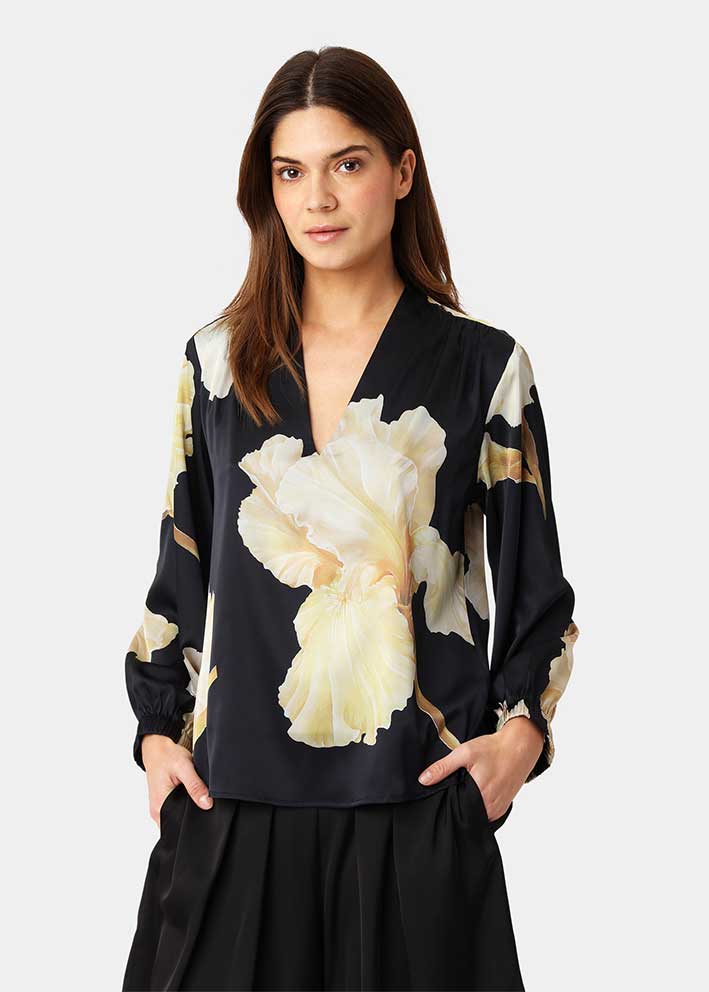 Smuk Jody bluse i det smukke nye print, gold maxi flower fra Karmamia, designet i silkeagtigt miljøvenligt polyester, der falder flot, ikke krøller og er super behageligt at have på. Blusen har en lille krave, v-udskæring, rynker ved skuldrene og lange ærmer med elastikkant.