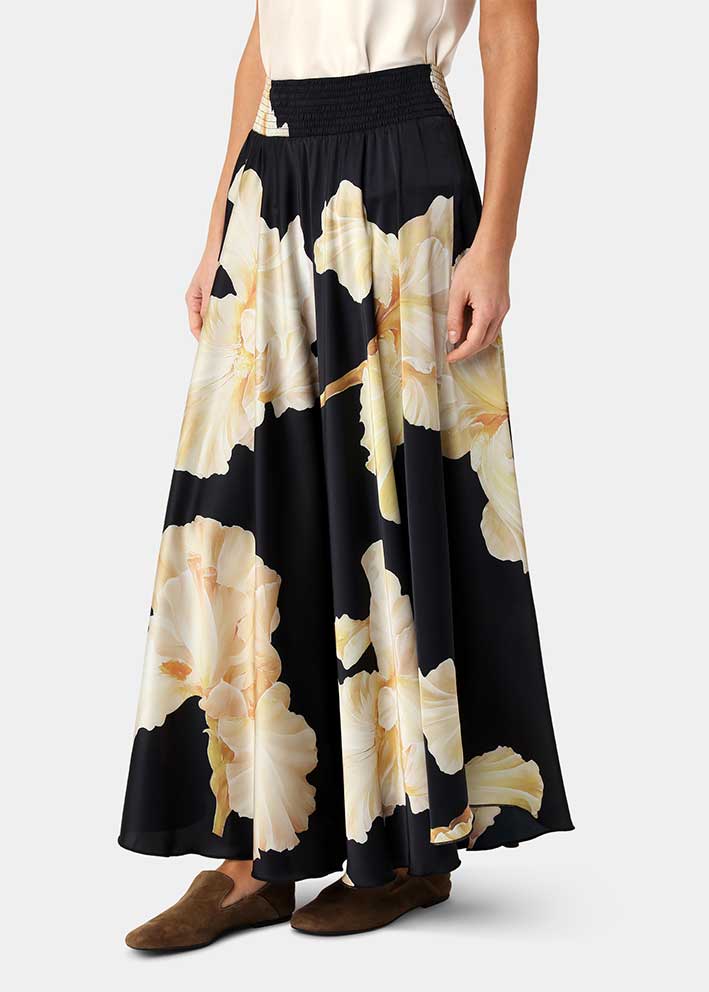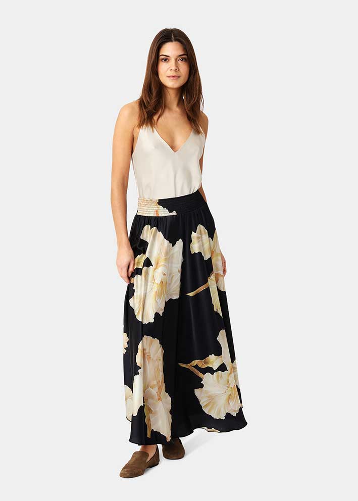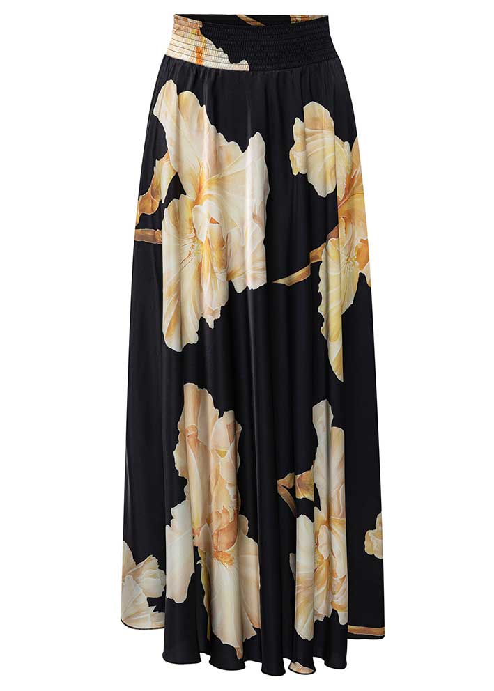 Smuk Savannah nederdel i det flotte nye print, gold maxi flower fra Karmamia. Nederdelen er designet i silkeagtigt miljøvenligt polyester, der falder flot, ikke krøller og er super behageligt at have på. Nederdelen har bred behagelig elastiktalje og masser af vidde.