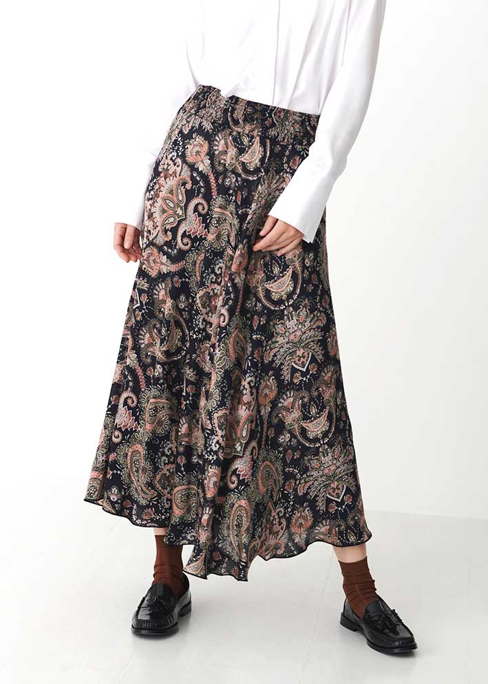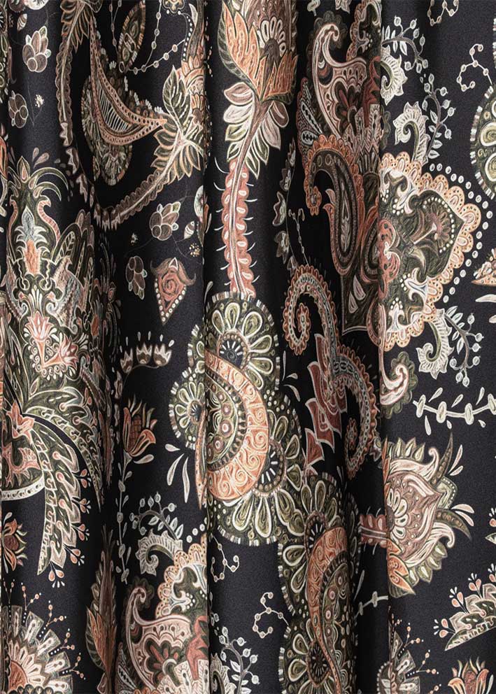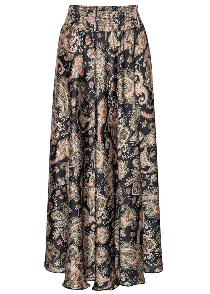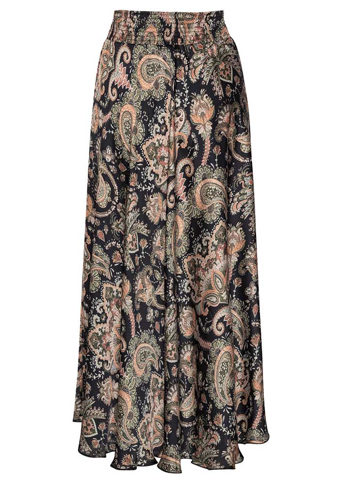 Smuk Savannah nederdel i det flotte nye print, khaki paisley fra Karmamia. Nederdelen er designet i silkeagtigt miljøvenligt polyester, der falder flot, ikke krøller og er super behageligt at have på. Nederdelen har bred behagelig elastiktalje og masser af vidde.