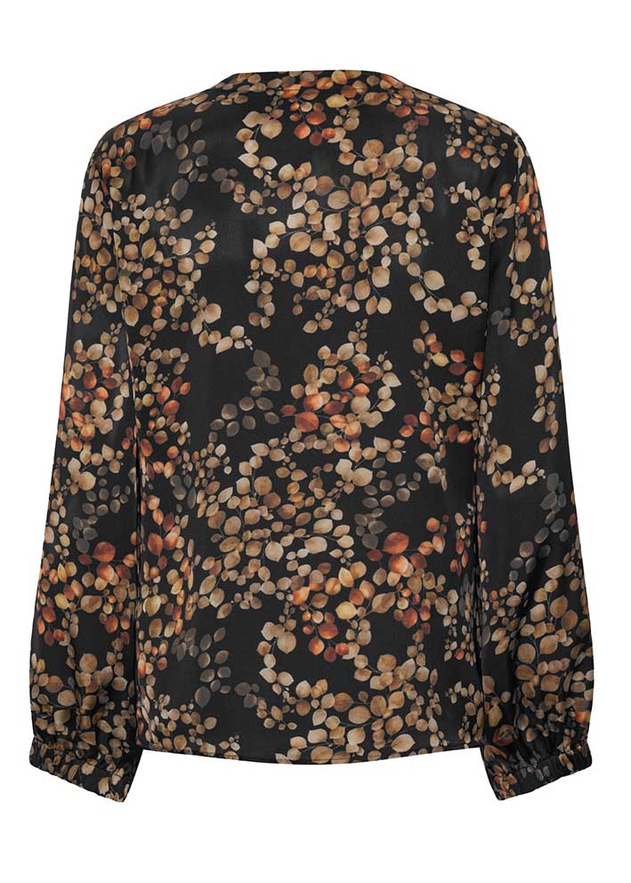 Smuk printet Sophia bluse fra Karmamia, designet med v-hals, elegante flæsedetaljer, knapper ned foran og lange ærmer med behagelig elastikmanchet.