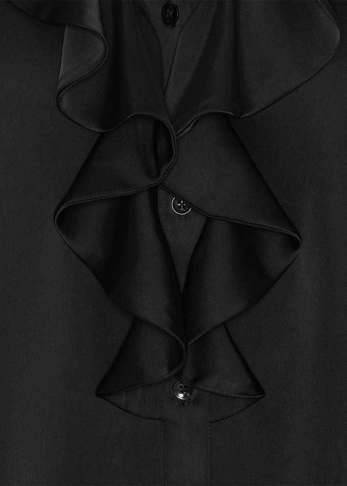 Smuk og feminin sort Sophia bluse fra Karmamia, designet med v-hals, elegante flæsedetaljer, knapper ned foran og lange ærmer med behagelig elastikmanchet.
