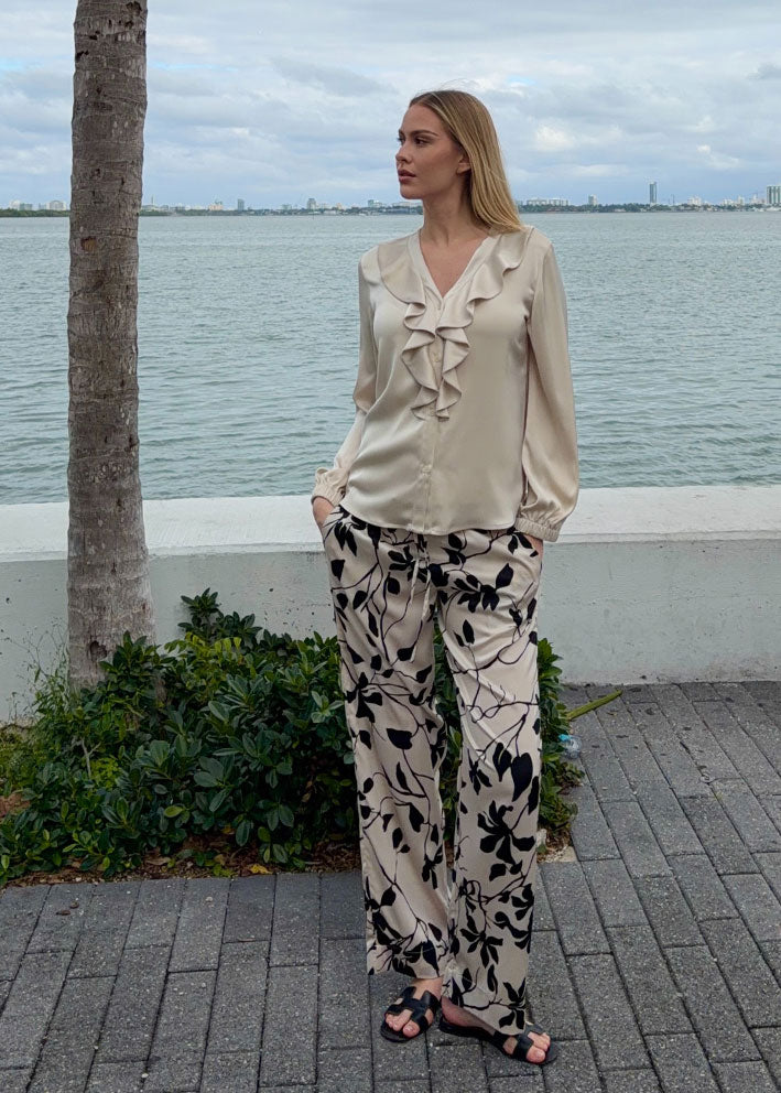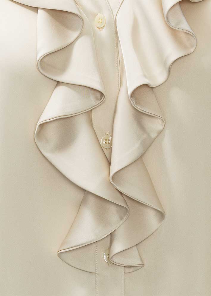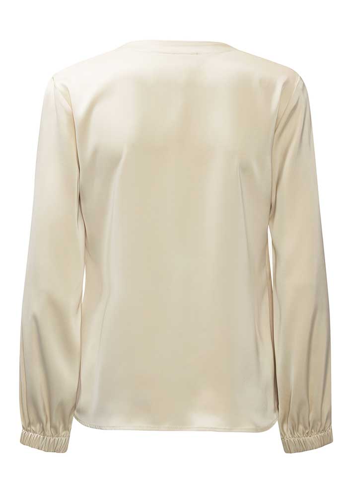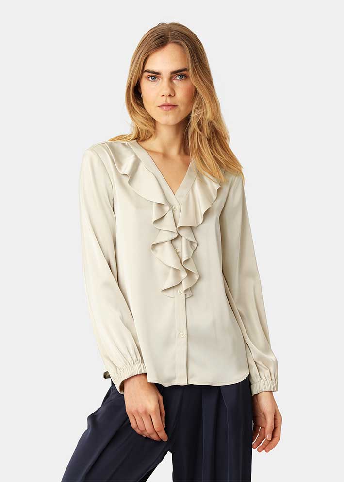Smuk og feminin cremefarvet Sophia bluse fra Karmamia, designet med v-hals, elegante flæsedetaljer, knapper ned foran og lange ærmer med behagelig elastikmanchet.