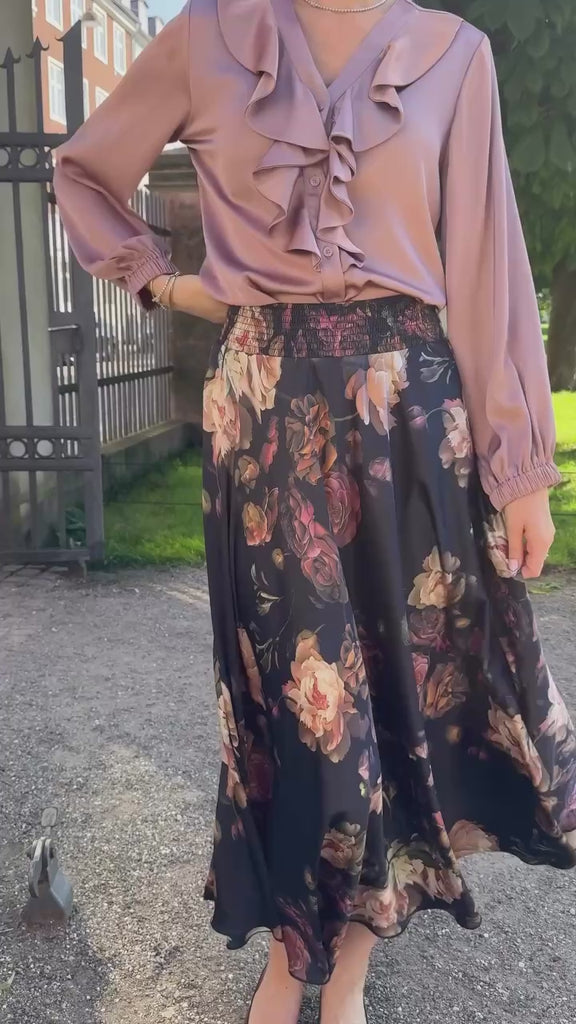 Smuk og feminin pudderrosa Sophia bluse fra Karmamia, designet med v-hals, elegante flæsedetaljer, knapper ned foran og lange ærmer med behagelig elastikmanchet.