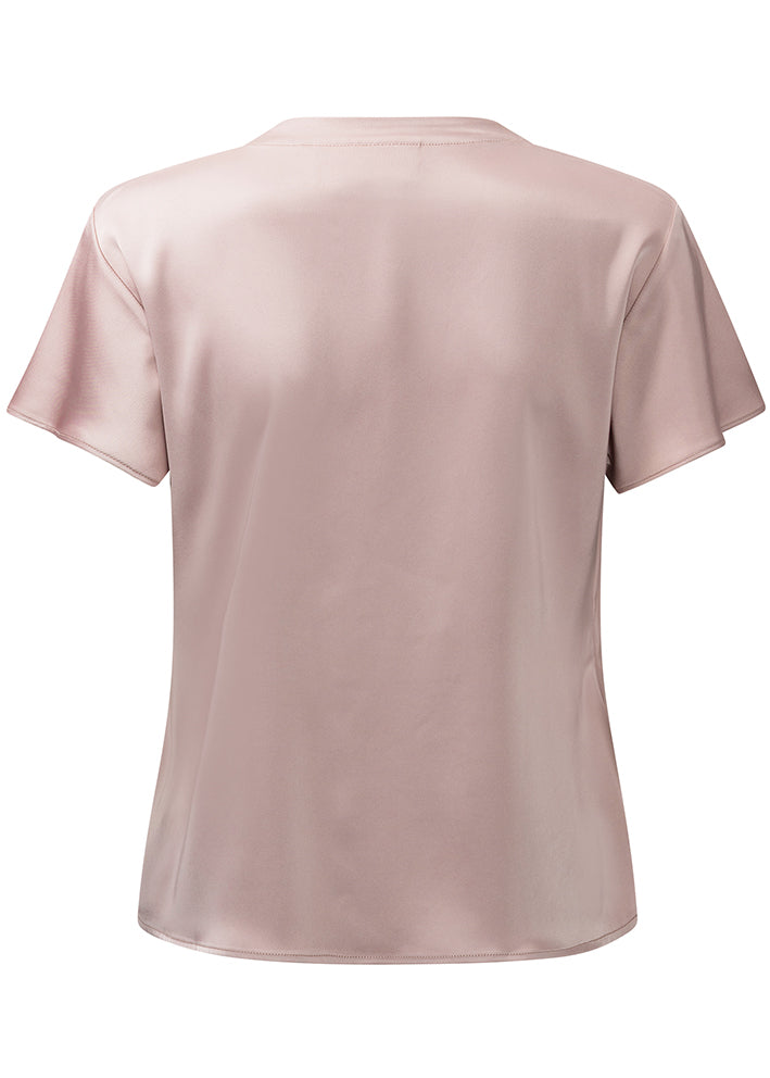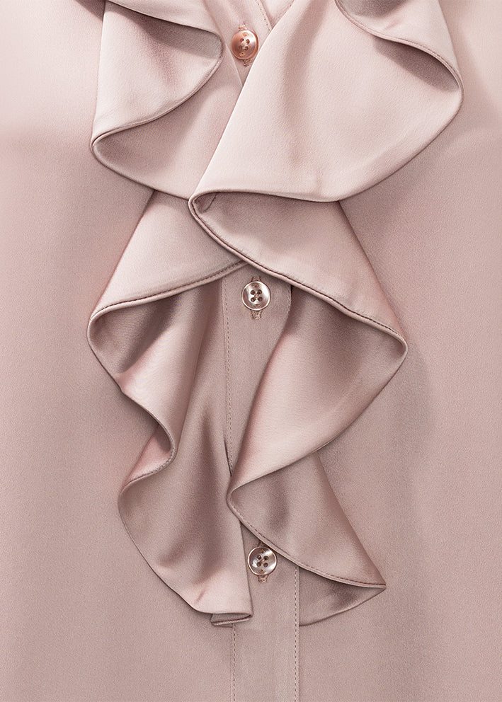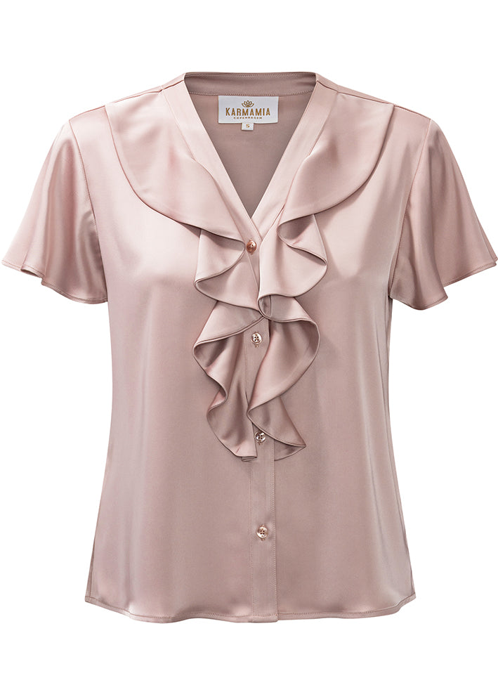Smuk og feminin pudderrosa Sophia bluse fra Karmamia, designet med v-hals, elegante flæsedetaljer, knapper ned foran og korte ærmer.