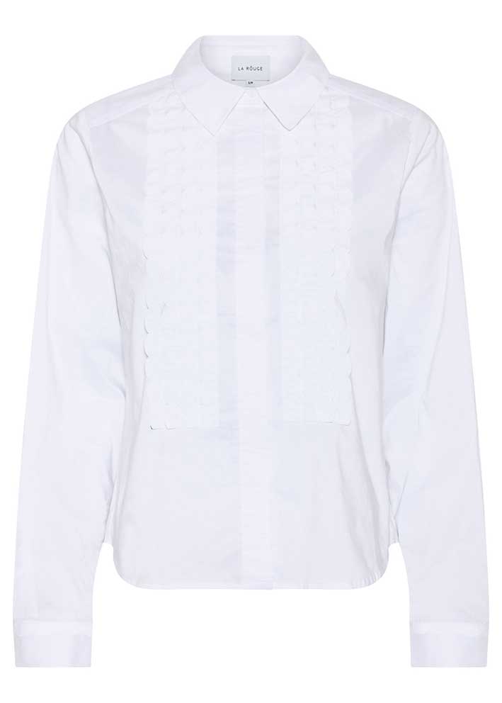 Smuk klassisk hvide Line skjorte fra La Rouge, designet med fine detaljer foran, der giver et stilrent og feminint udtryk. Designet har en lige pasform med lange ærmer, manchetter og en traditionel skjortekrave, som gør den nem at style på tværs af garderoben.