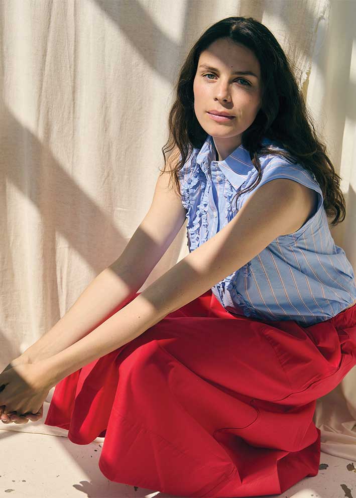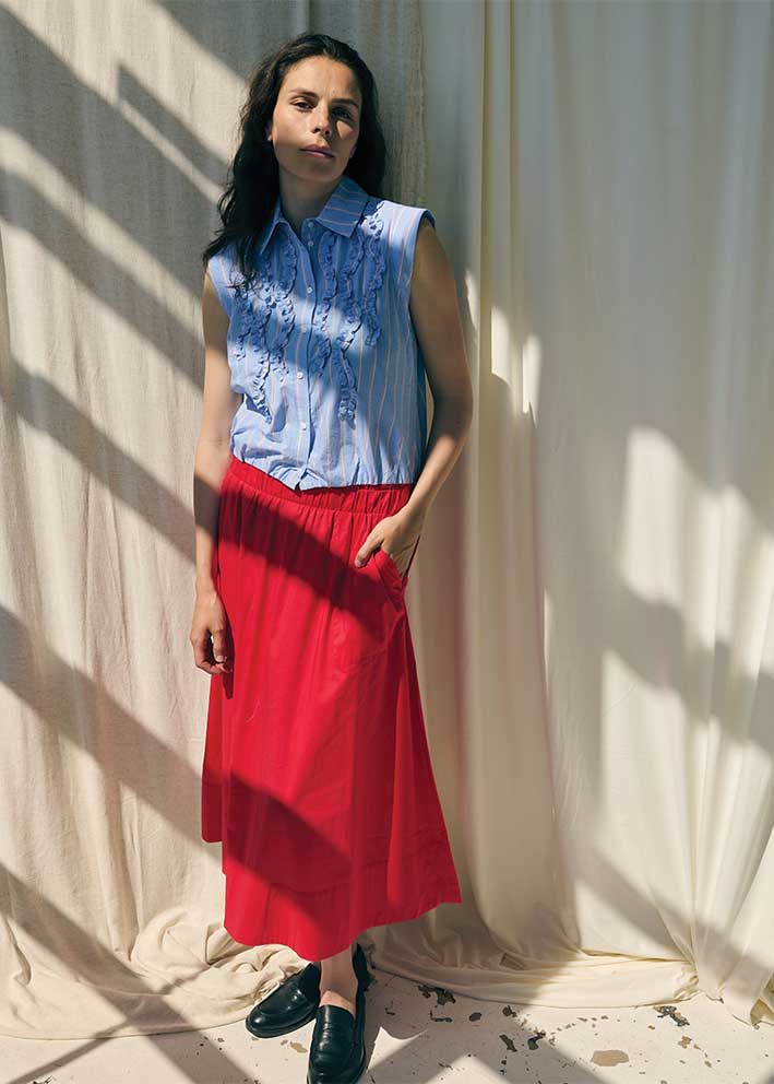 Nederdelen har et hav at stylingmuligheder. Brug den eksempelvis med en vamset strik, en feminin bomuldsskjorte eller en enkel t-shirt. Nederdelen har en cool længde, der gør at den både kan bruges med sneakers, loafers eller støvler.