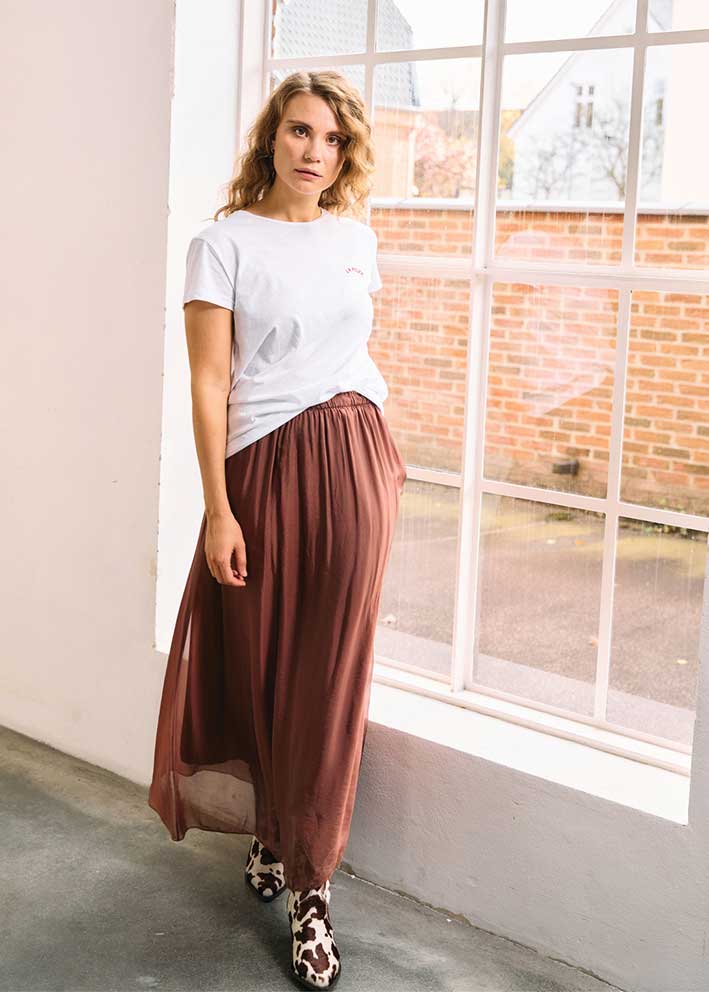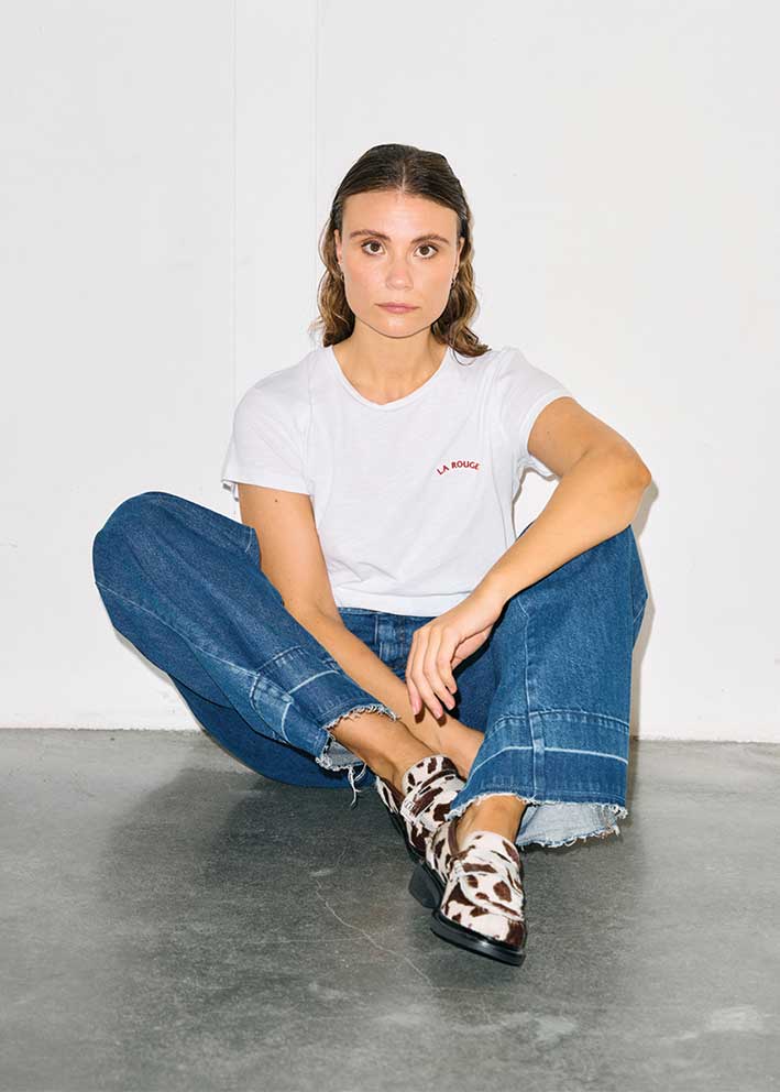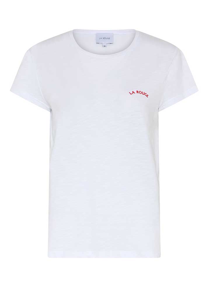 Klassisk hvid Sille t-shirt fra La Rouge, designet med et lille logo på brystet. T-shirten er fremstillet i 100% blød slubyarn bomuld, der er ideel til varme sommerdage. Med sin klassiske pasform, runde hals og korte ærmer er den et alsidigt valg, der nemt kan styles til både hverdag og mere trendy looks.