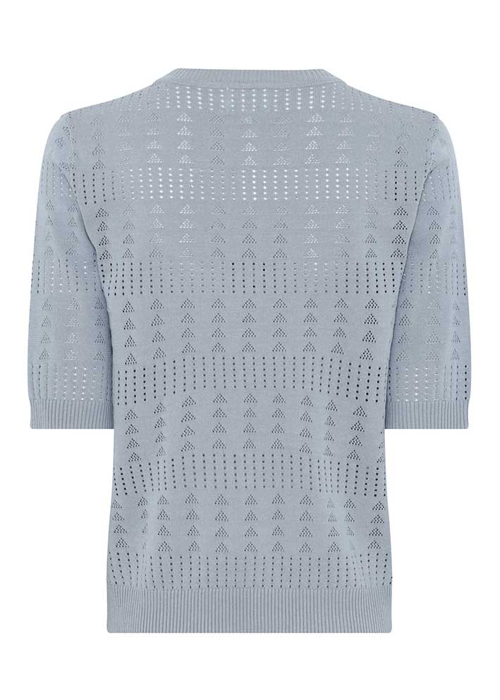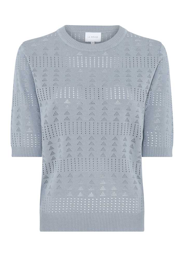 Smuk mønsterstrikket lyseblå Alma strik fra La Rouge - en kortærmet strik med fint hulmønster, der giver et let og luftigt udtryk. Den enkle pasform gør den komfortabel og nem at style til hverdagsbrug.