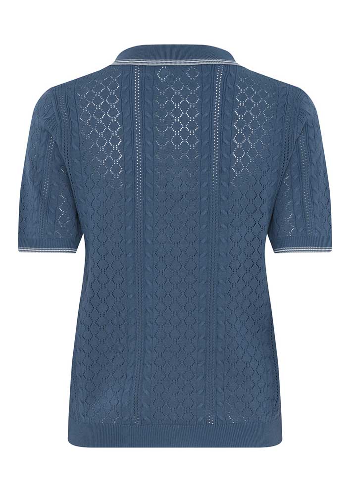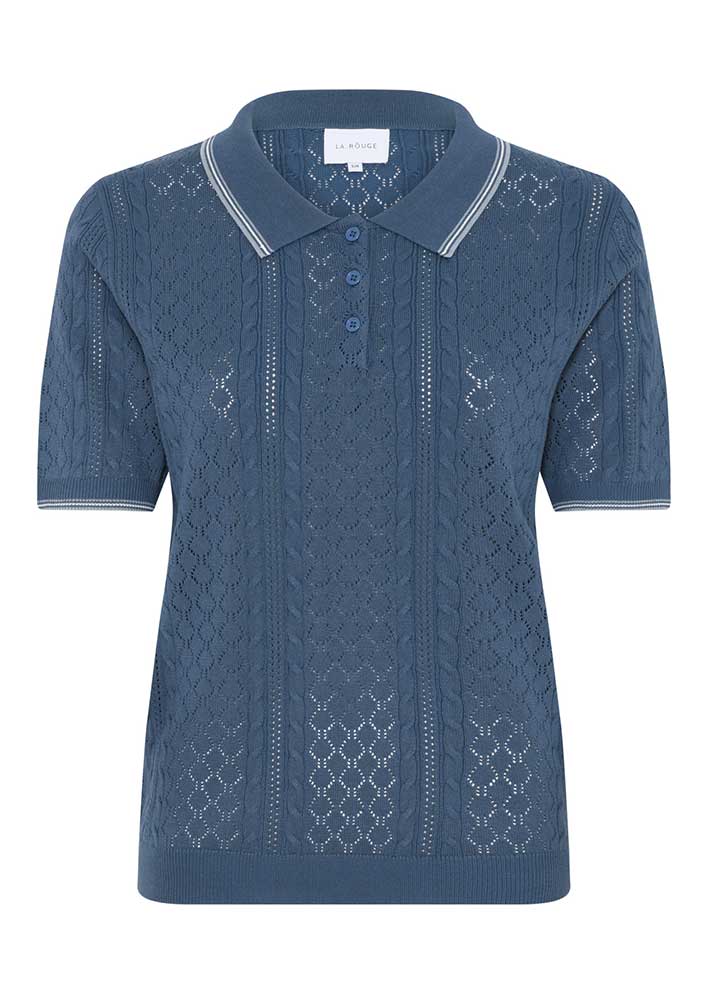 Smuk blå Alma Polo fra La Rouge - en kortærmet strik med et fint hulmønster, som giver et let og luftigt udtryk. Den klassiske polokrave med kontraststriber og den diskrete knaplukning foran, tilføjer et tidløst og sofistikeret element, der gør strikken både stilfuld og enkel.