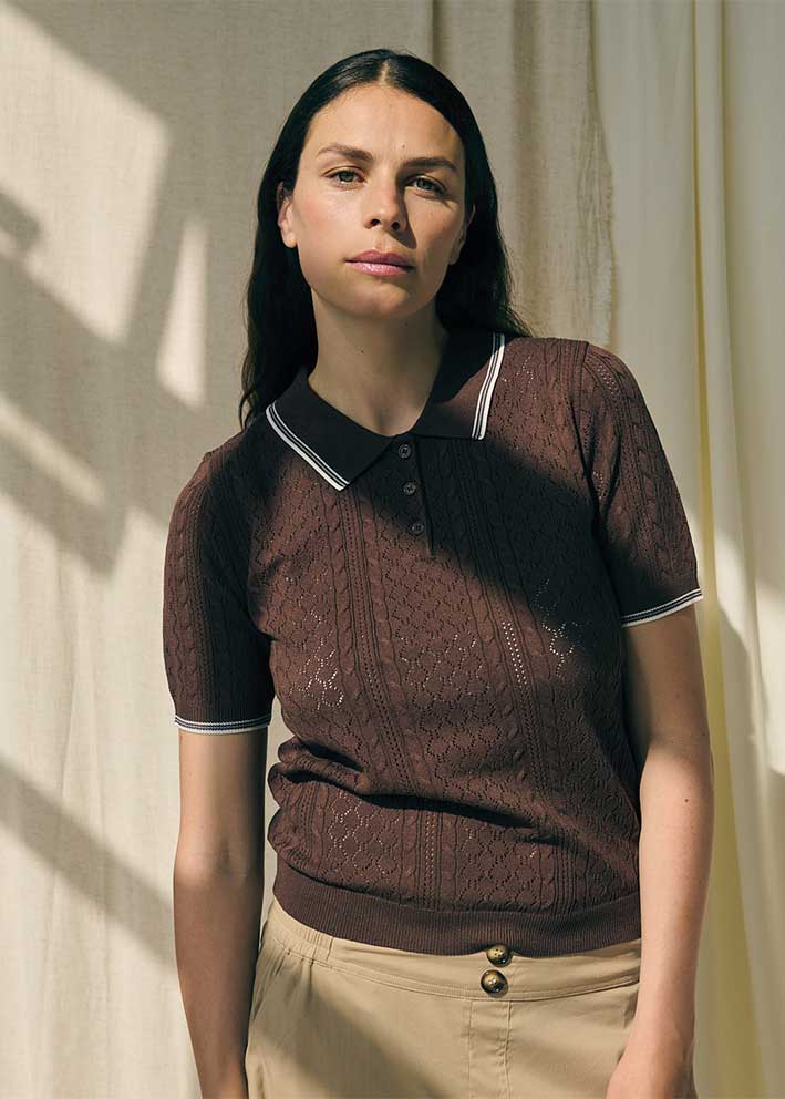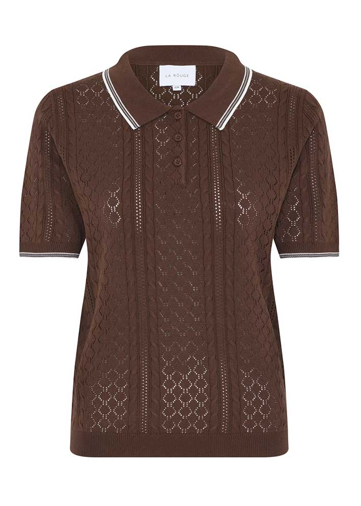 Smuk mørkebrun Alma Polo fra La Rouge - en kortærmet strik med et fint hulmønster, som giver et let og luftigt udtryk. Den klassiske polokrave med kontraststriber og den diskrete knaplukning foran, tilføjer et tidløst og sofistikeret element, der gør strikken både stilfuld og enkel.