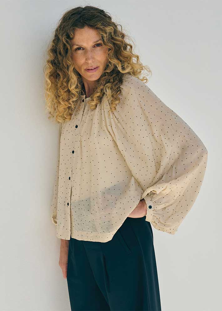 Skøn let Dot skjorte fra La Rougen, designet i en lækker Rayon-kvalitet med små sorte prikker, der giver et friskt og legende udtryk. Skjorten er luftig, har rund hals og ballonærmer, som tilføjer bevægelse og et blødt, feminint touch til den enkle pasform.