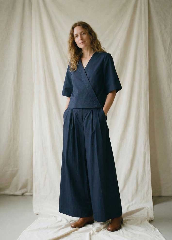 Skønne navyblå Pia bukser fra La Rouge - en buksemodel, der kombinerer klassisk skræddersyet elegance med afslappet vidde. De navyblå wide leg-bukser fra La Rouge er skabt i en fast 100% bomuldskvalitet, der holder formen og giver et skarpt, poleret udtryk fra morgen til aften.