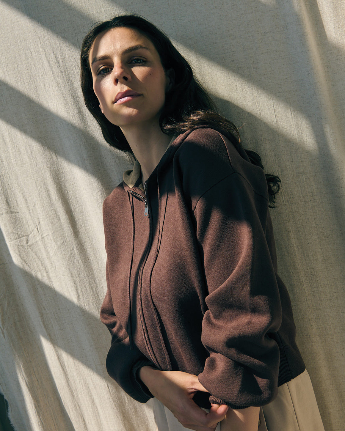 Skøn chokoladebrun Sofie hoodie fra La Rouge, strikket i en blød viscosekvalitet. Cardiganen har lynlås foran, ballonærmer og hætte med lyse farve indvendig for en fin kontrast.