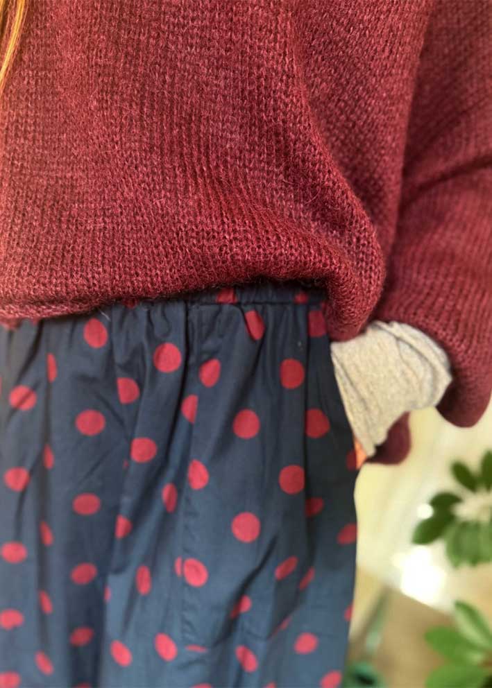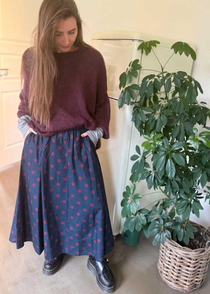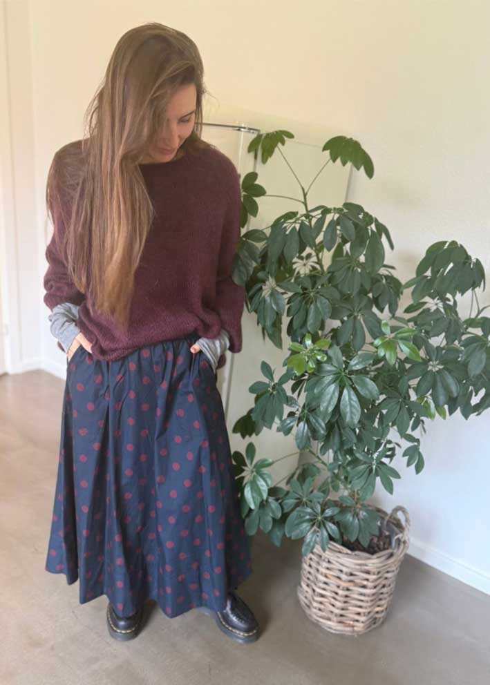 Skøn mørkeblå Vilma Dot nederdel med vinrøde prikker fra La Rouge, designet i et sporty snit med elastiktalje og lommer i siden.