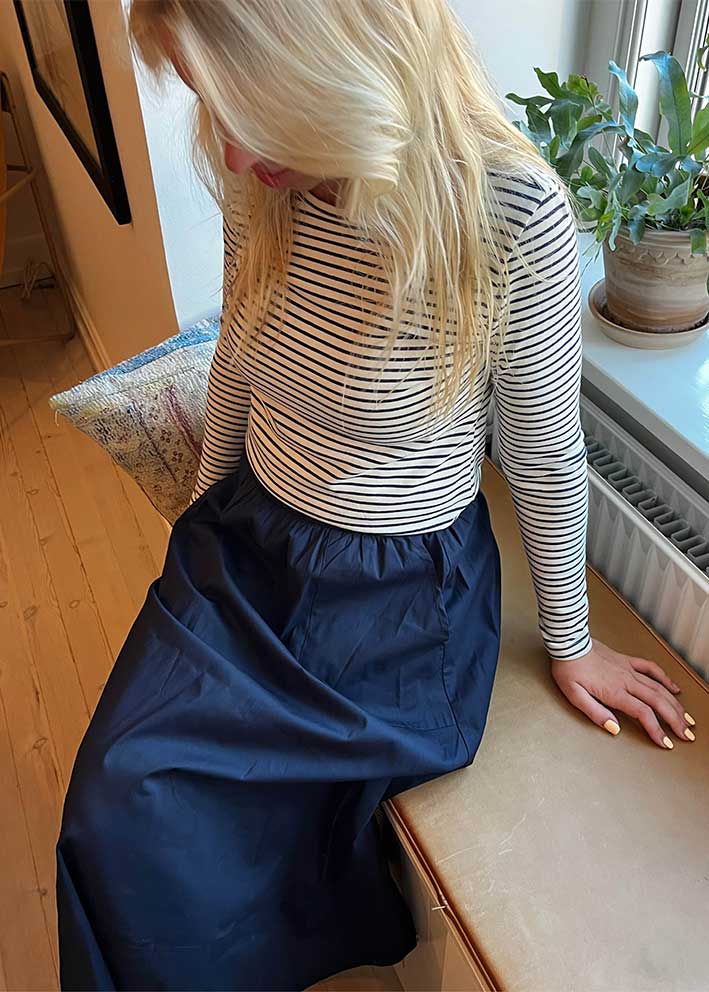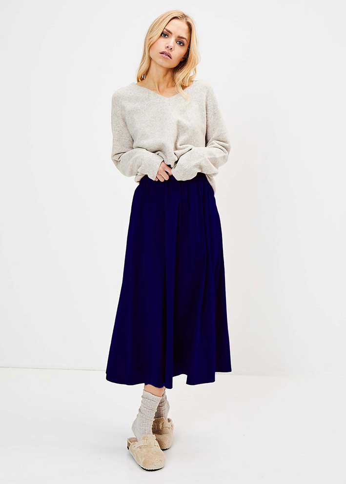 Nederdelen har et hav at stylingmuligheder. Brug den eksempelvis med en vamset strik, en feminin bomuldsskjorte eller en enkel t-shirt. Nederdelen har en cool længde, der gør at den både kan bruges med sneakers, loafers eller støvler.