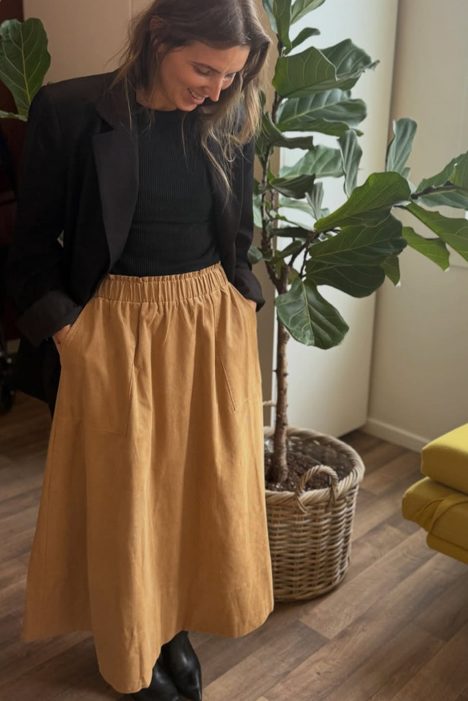 Vilma nederdel i babyfløjl! ♥ Skøn camelfarvet Vilma fløjlsnederdel fra La Rouge, designet i et enkelt, klassisk snit med elastiktalje og lommer i siden.