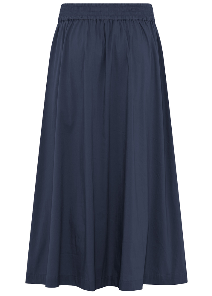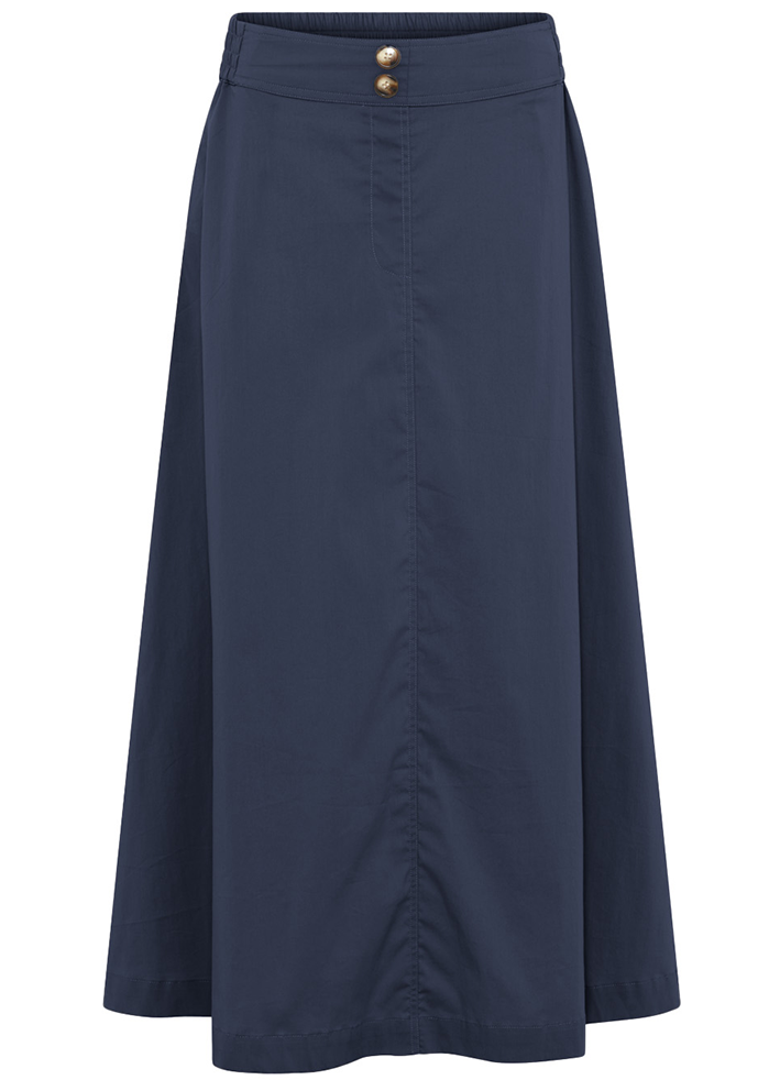 Smuk lang mørkeblå Vilma nederdel fra La Rouge - en nyfortolkning af den ultimative bestseller – nu i en længere version i samme luksuriøse kvalitet, der falder let og føles behagelig mod kroppen. Taljen har fået et nyt udtryk med elastik bagpå og i siderne for en komfortabel pasform og fronten er glat og afsluttet med to fine pynteknapper for et sofistikeret look.