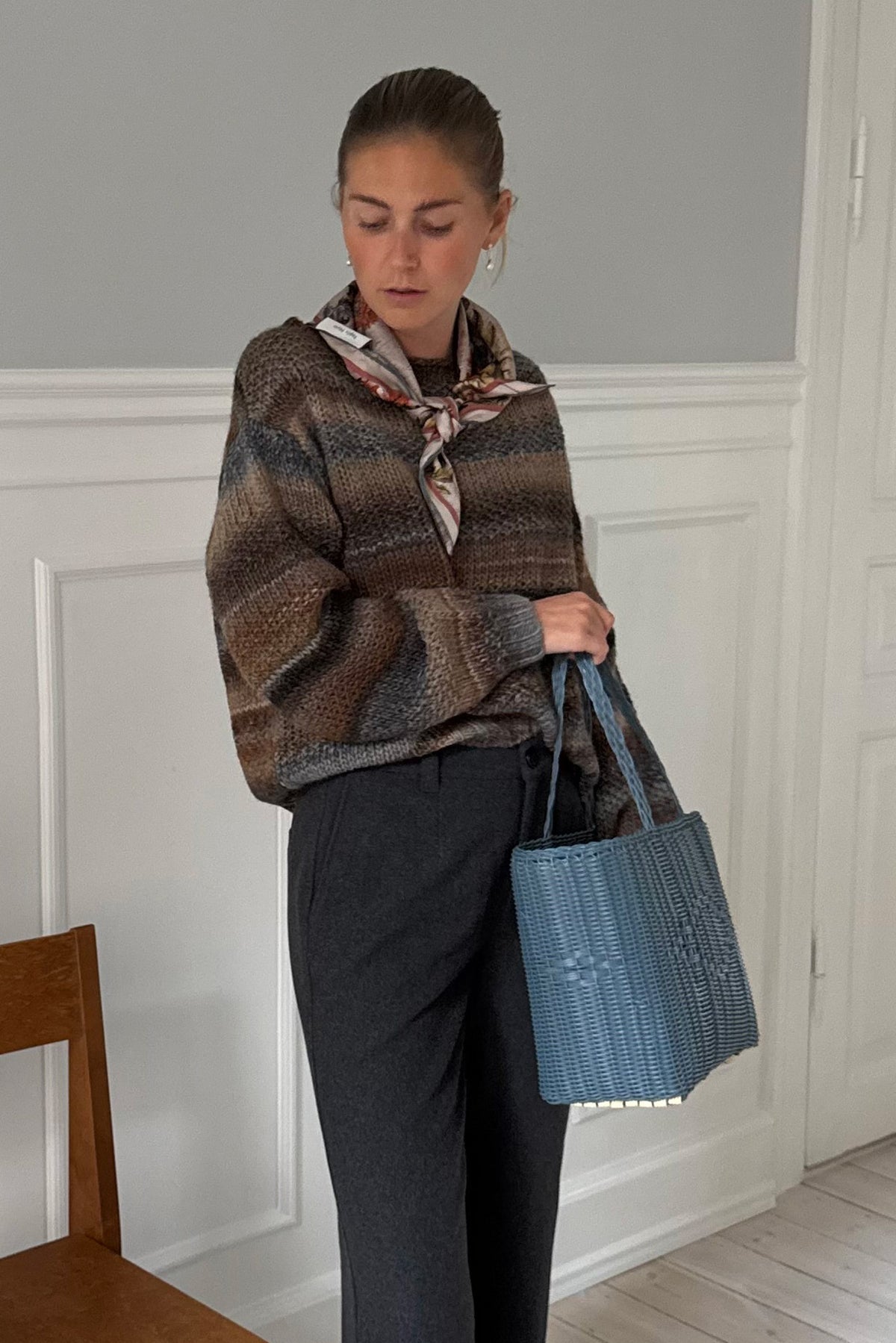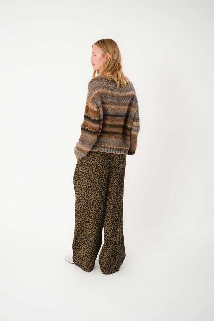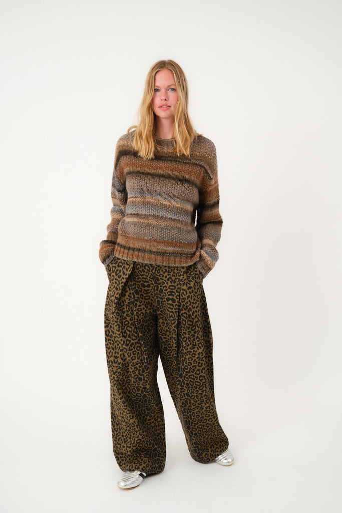 Skøn stribet/mønsterstrikket Fairhaven sweater fra Lollys Laundry, designet med et smuktfarvespil i nuancer af brun, grå og mørk sand.