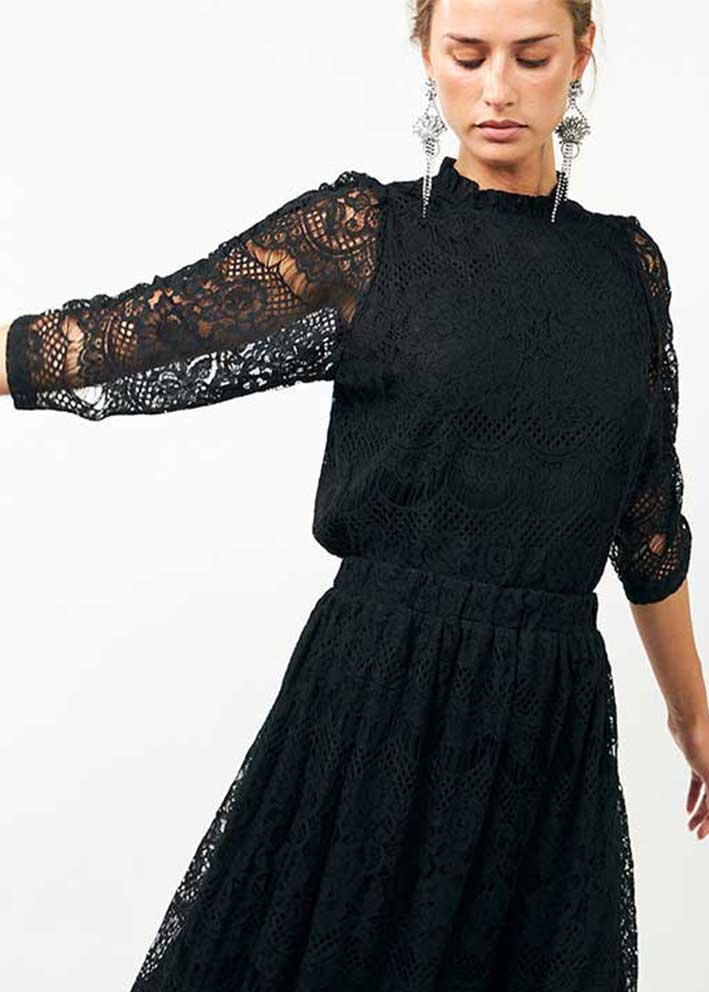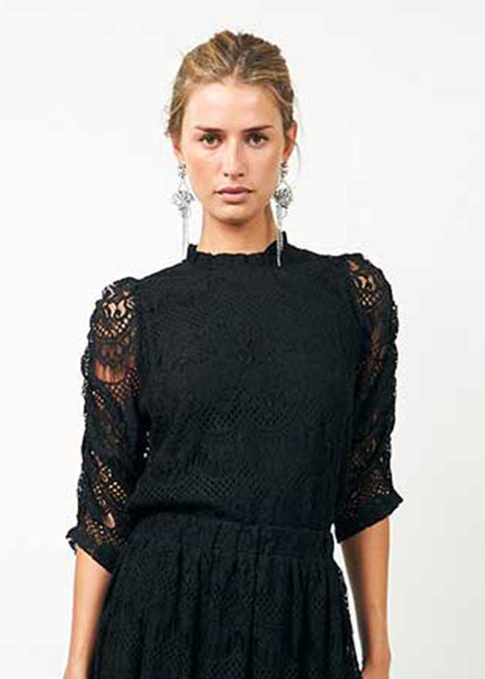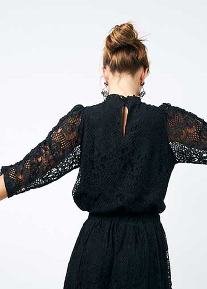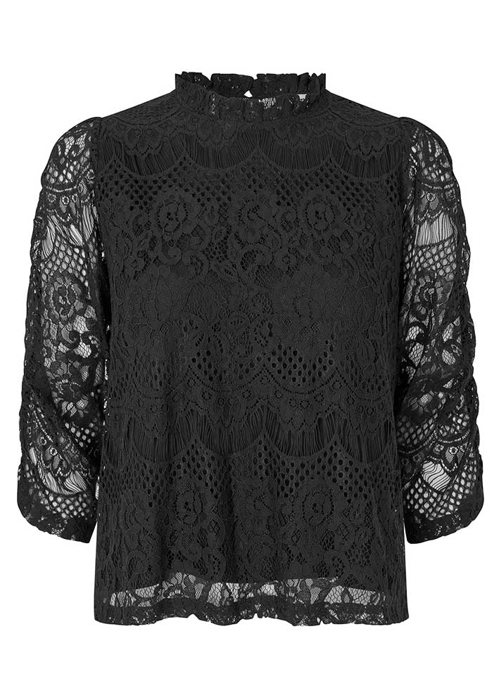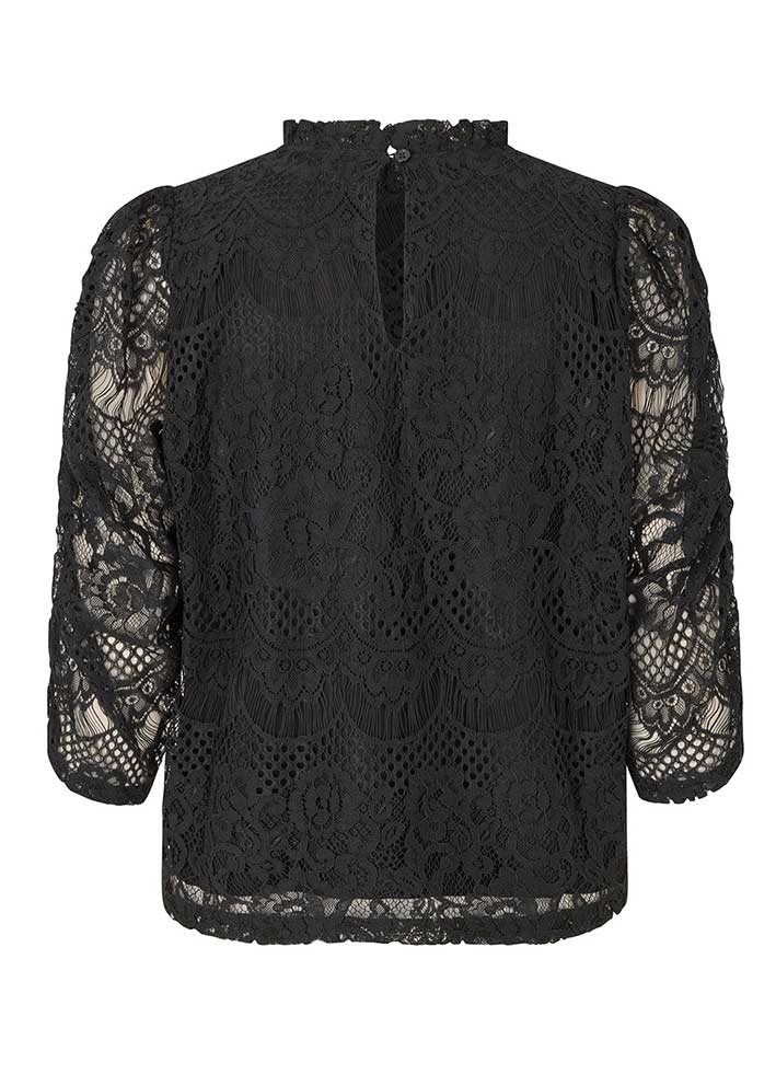 Smuk og elegant sort Lilou blondebluse fra Lollys Laundry, designet med et smukt blondemønster, der giver et feminint og sofistikeret udtryk. Blusen har en lille stående hals med miniflæse, slids og knap i nakken og 3/4-lange ærmer med fine læg.