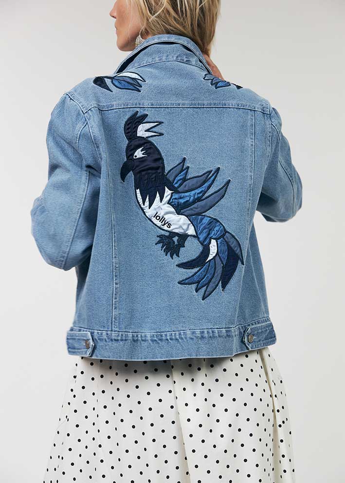 Bird Denim Jakke fra Lollys Laundry er den perfekte overgangsjakke til din garderobe. Med sin klassiske denim-stil i smuk washed denim-finish og unikke broderier foran - og især på ryggen - får du en jakke, der passer til enhver lejlighed.