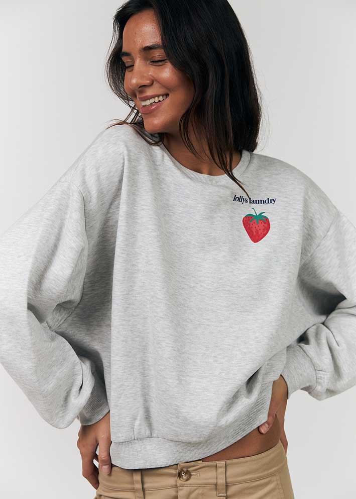Skøn, blød og afslappet gråmeleret Sydney Strawberry sweatshirt fra Lollys Laundry, designet i en lækker bomuldskvalitet. Fantastisk fed sweatshirt, der skiller sig ud med sin smukke jordbærprint
