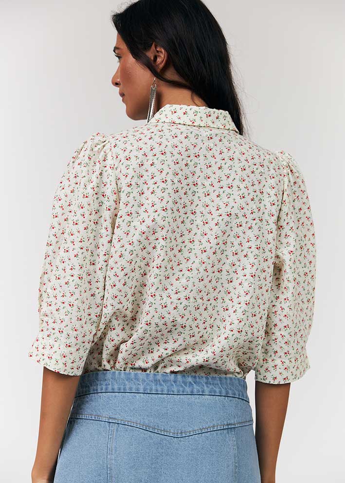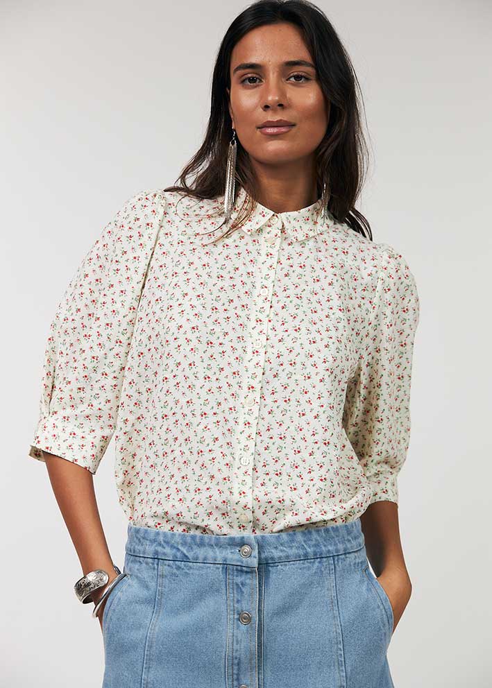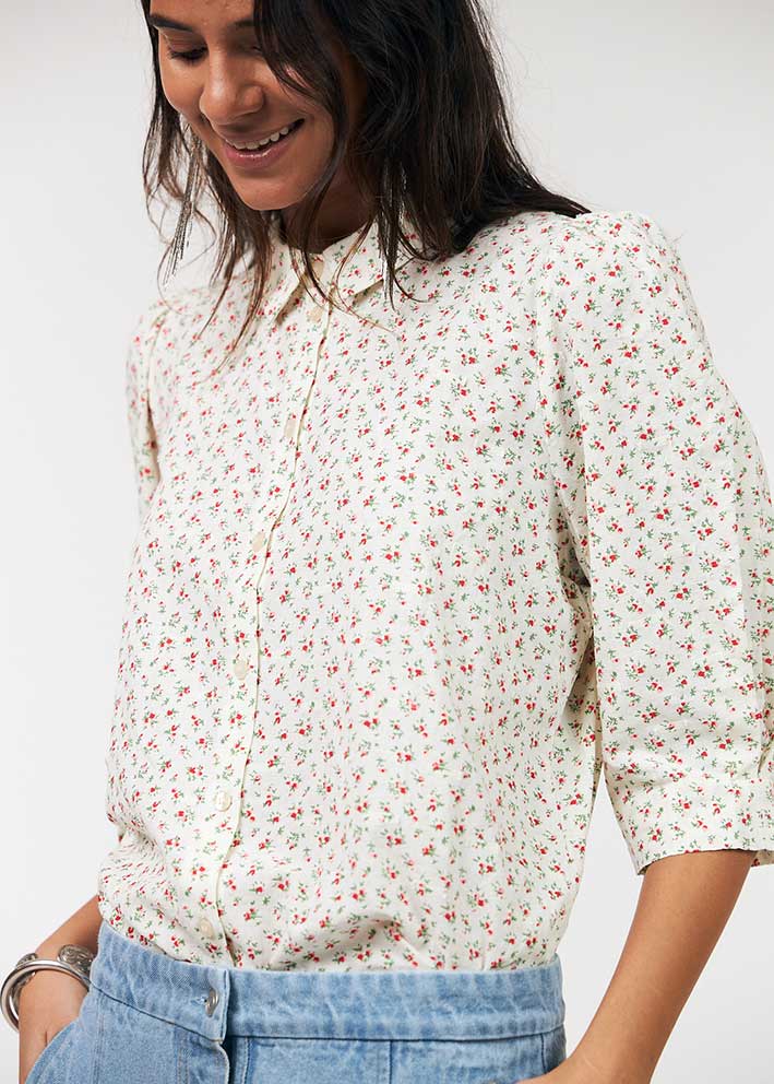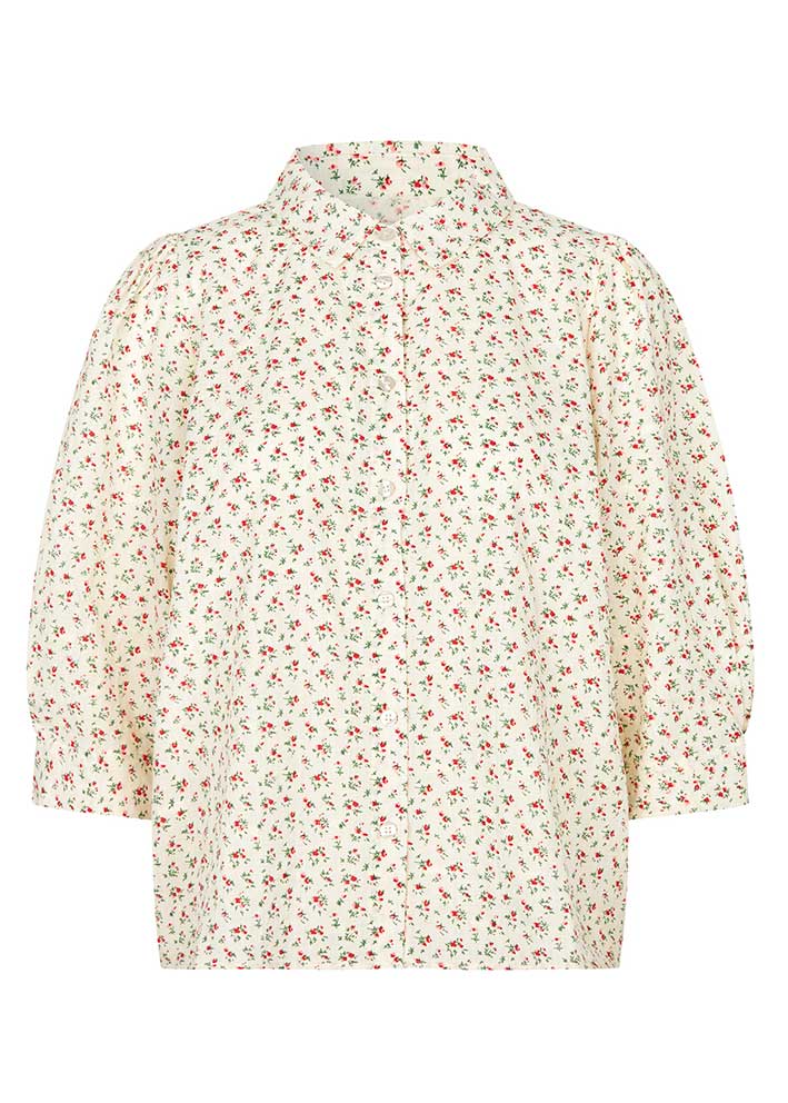 Smuk blomsterprintet Bono skjorte fra Lollys Laundry, desgnet i en lækker let bomuldskvalitet. Skjorten har et løst snit med lille krave, knapper ned foran og halvlange let puffede ærmer.