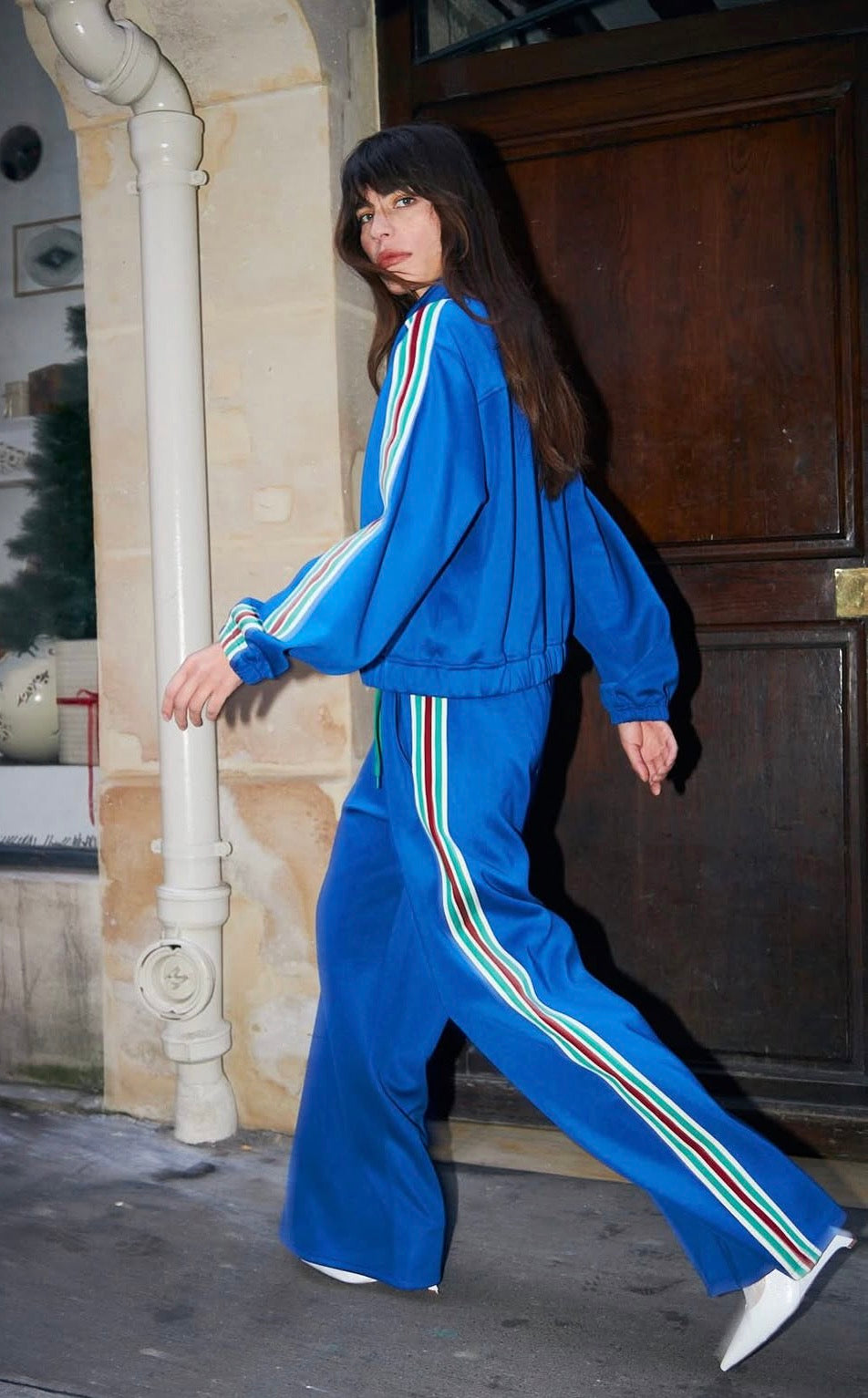Smuk klar blå Brooklynn jakke fra Lollys Laundry - en sporty nyhed med et feminint touch. De farvede striber langs ærmerne og det lille jordbærbroderi på fronten tilføjer et friskt touch. Den er let, behagelig og perfekt både til jeans eller som et komplet sæt med Liam bukserne.