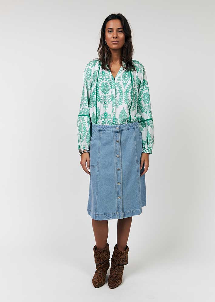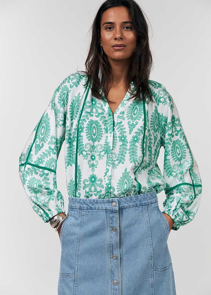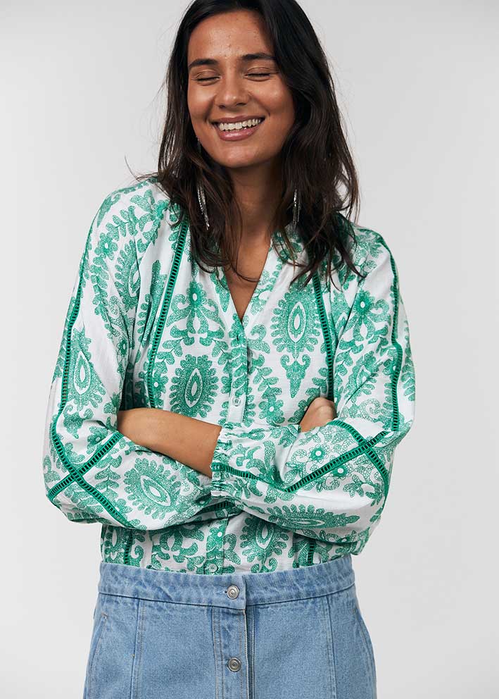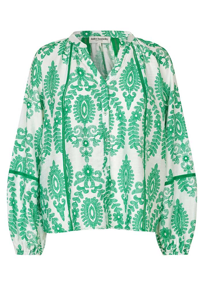 Smuk grønmønstret, let og feminin Vero skjorte fra Lollys Laundry, designet med smukke detaljer. Den er lavet i en flot og lækker viscosekvalitet, der falder smukt og har et dekorativt, all over print.