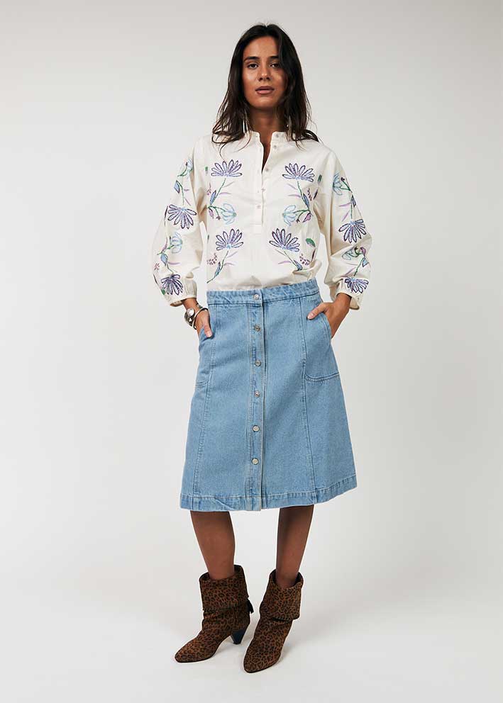 Faith skjorteblusen fra Lollys Laundry er en drøm af en bluse med håndlavede blomsterbroderier, der bringer liv og farve til din garderobe. Den rummelige pasform og den bløde bomuldskvalitet sikrer komfort fra morgen til aften.