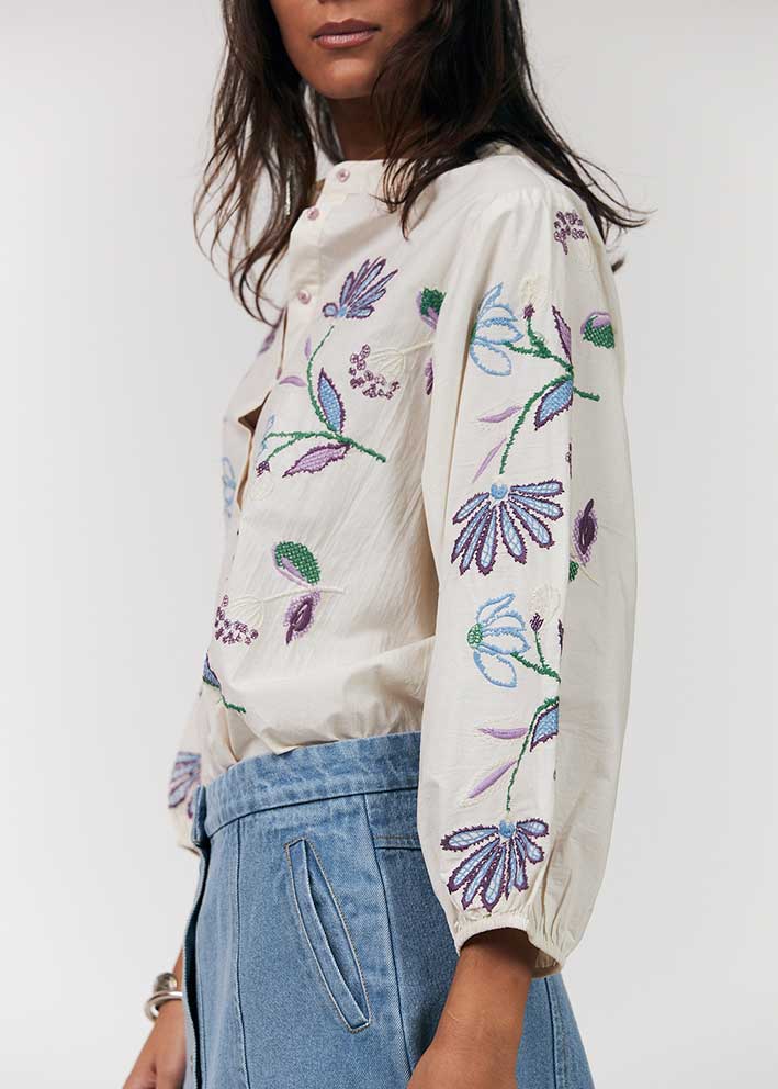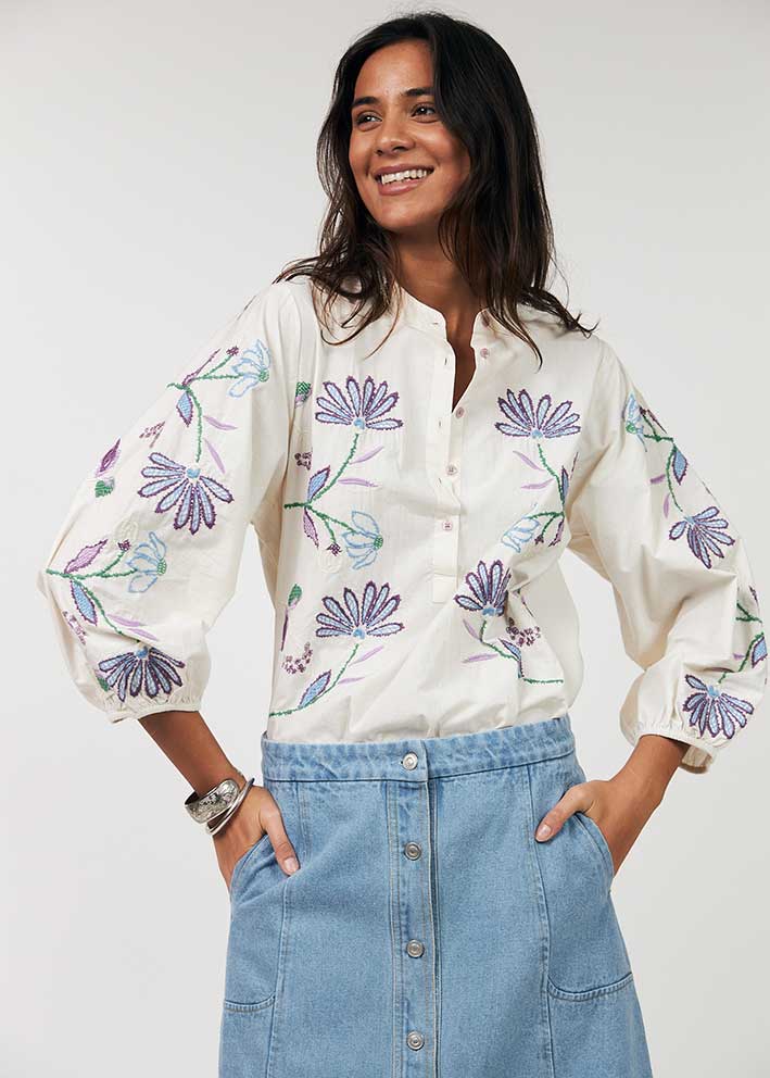 • Romantisk bluse med detaljerede blomsterbroderier på front og ærmer