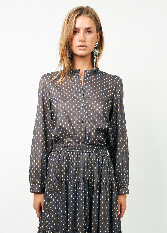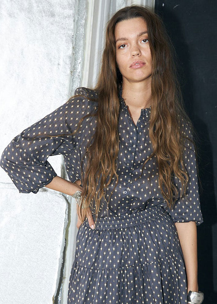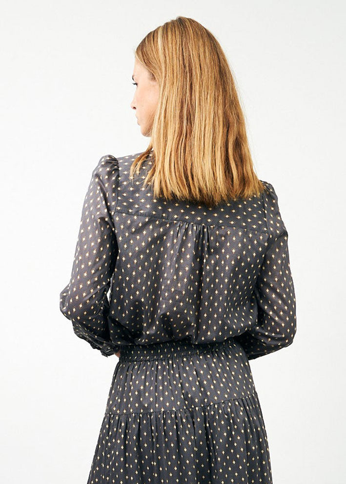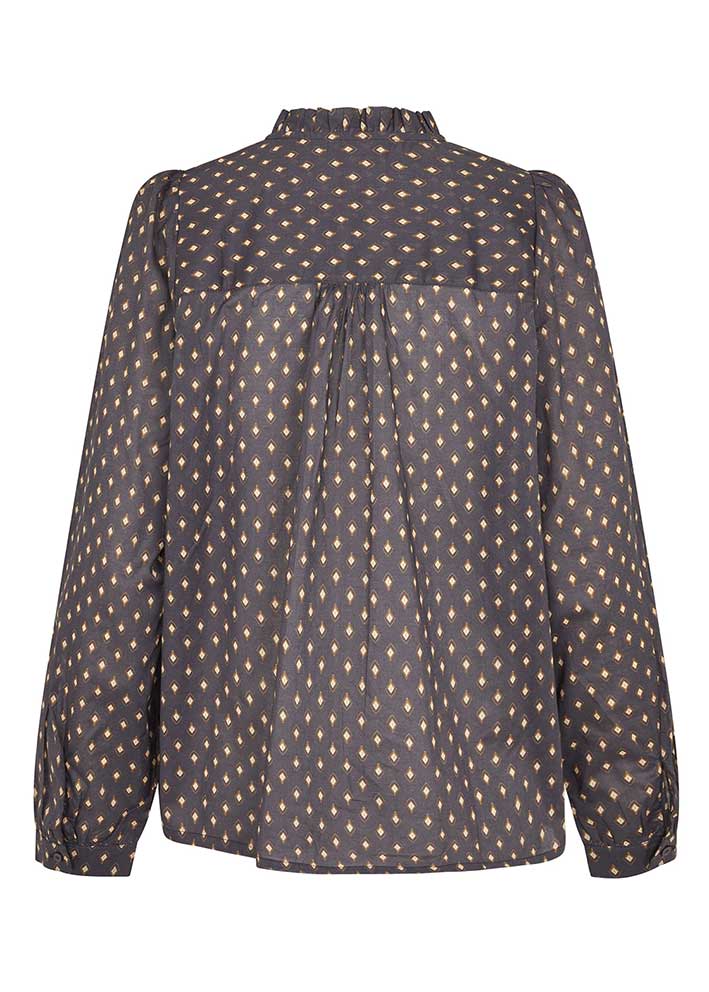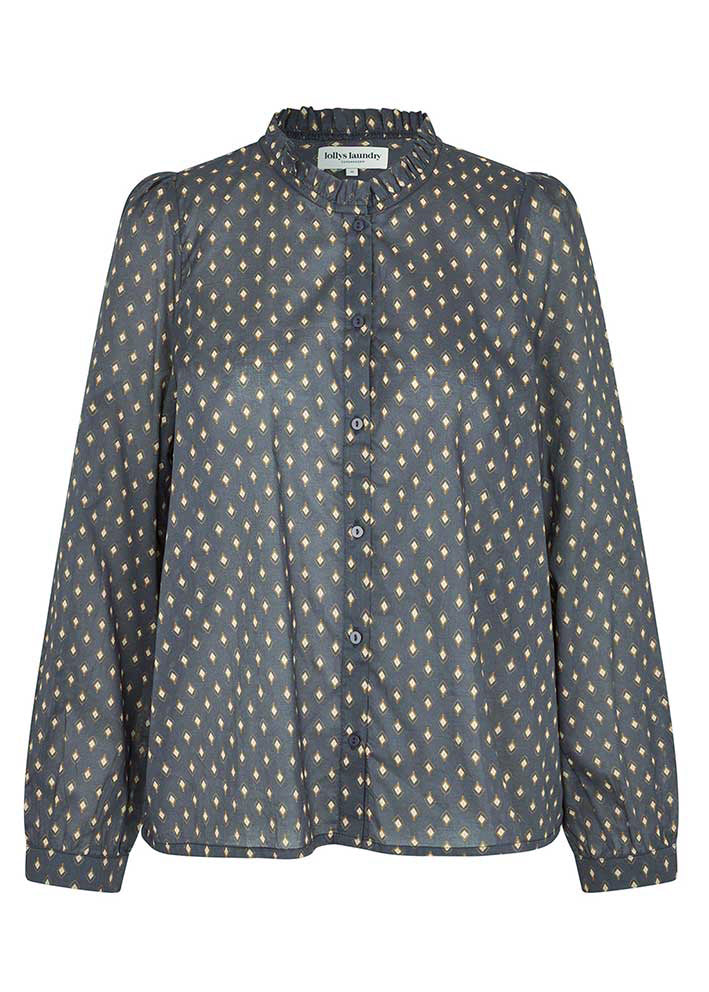 Smuk og elegant mørkeblå River skjorte fra Lollys Laundry, designet med et fint mønster. Skjorten har en lille stående flæsekrave, lange ærmer med let puf og manchet med knap samt knapper ned foran.