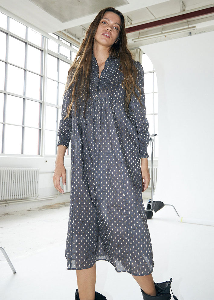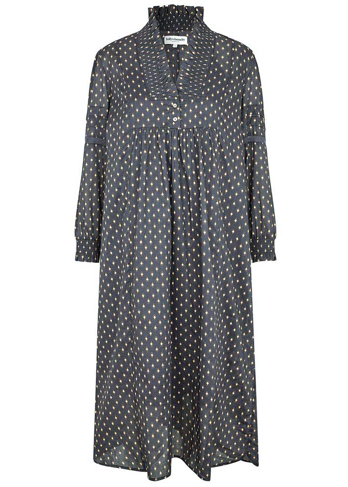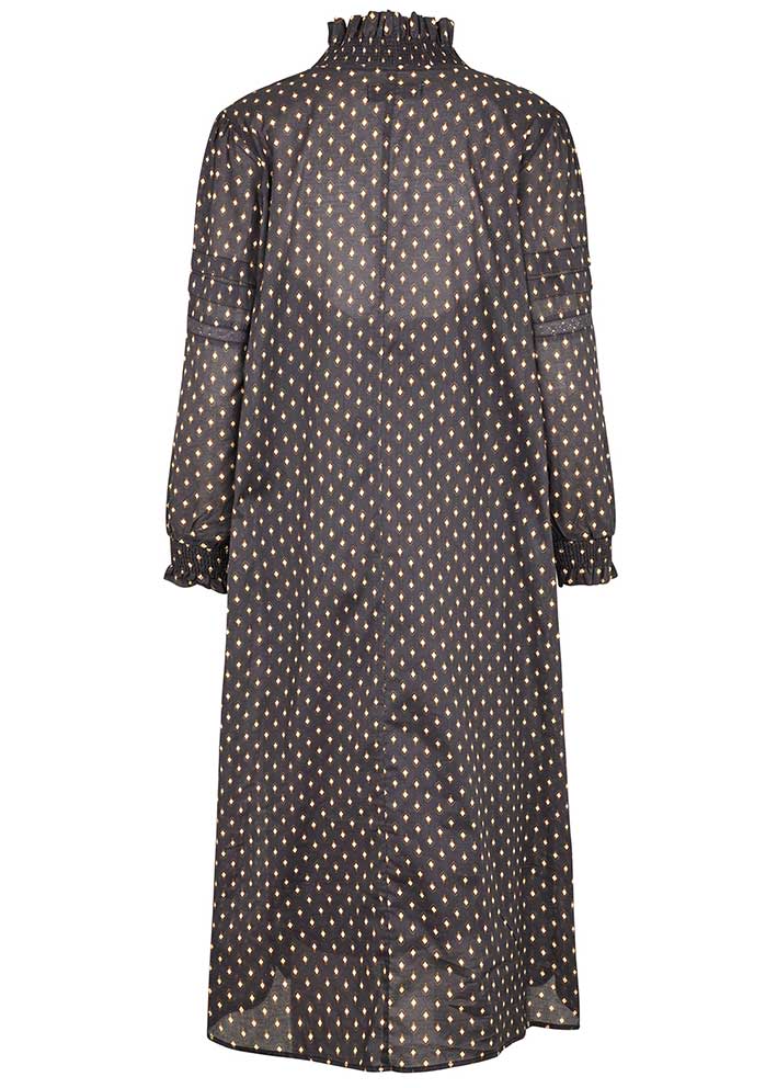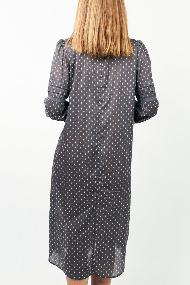 Smuk og elegant lang mørkeblå Sagi kjole fra Lollys Laundry, designet med et fint mønster. Skjorten har flæsekrave med smockkanter og lille stolpelukning med knapper samt lange ærmer med fine blondedetaljer og smockmanchetter.