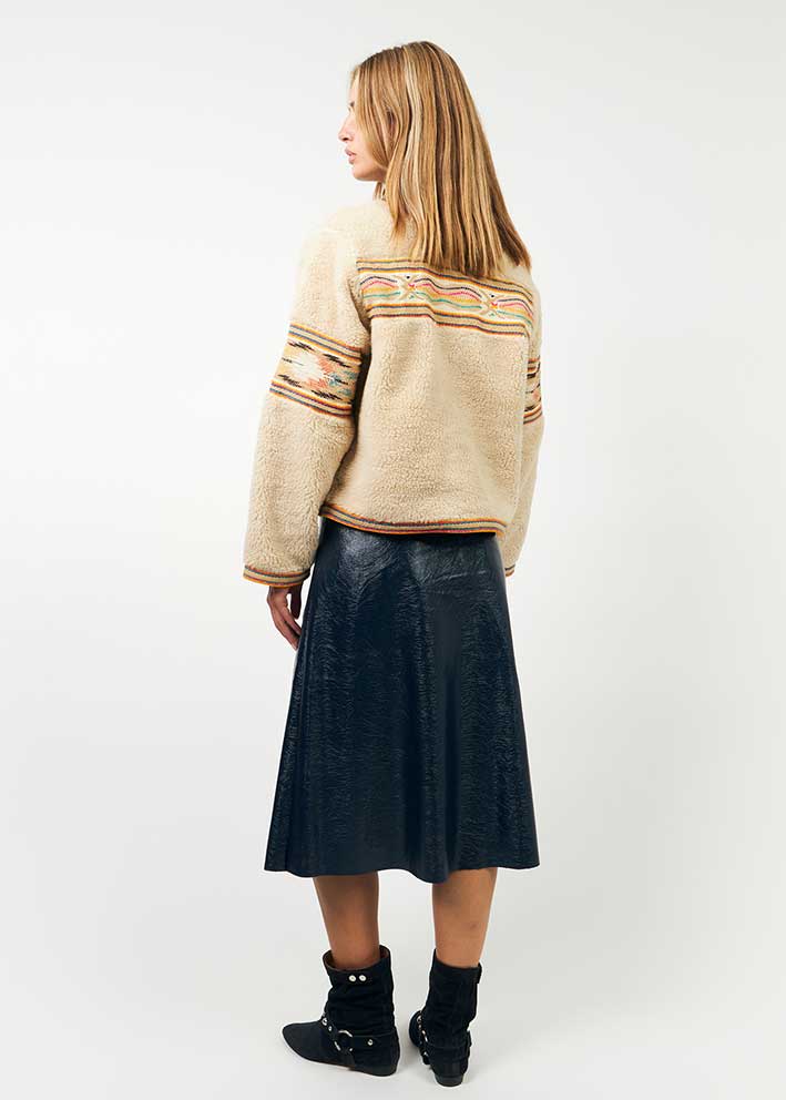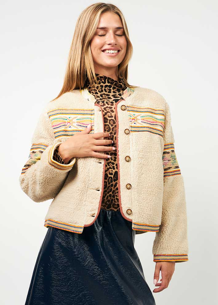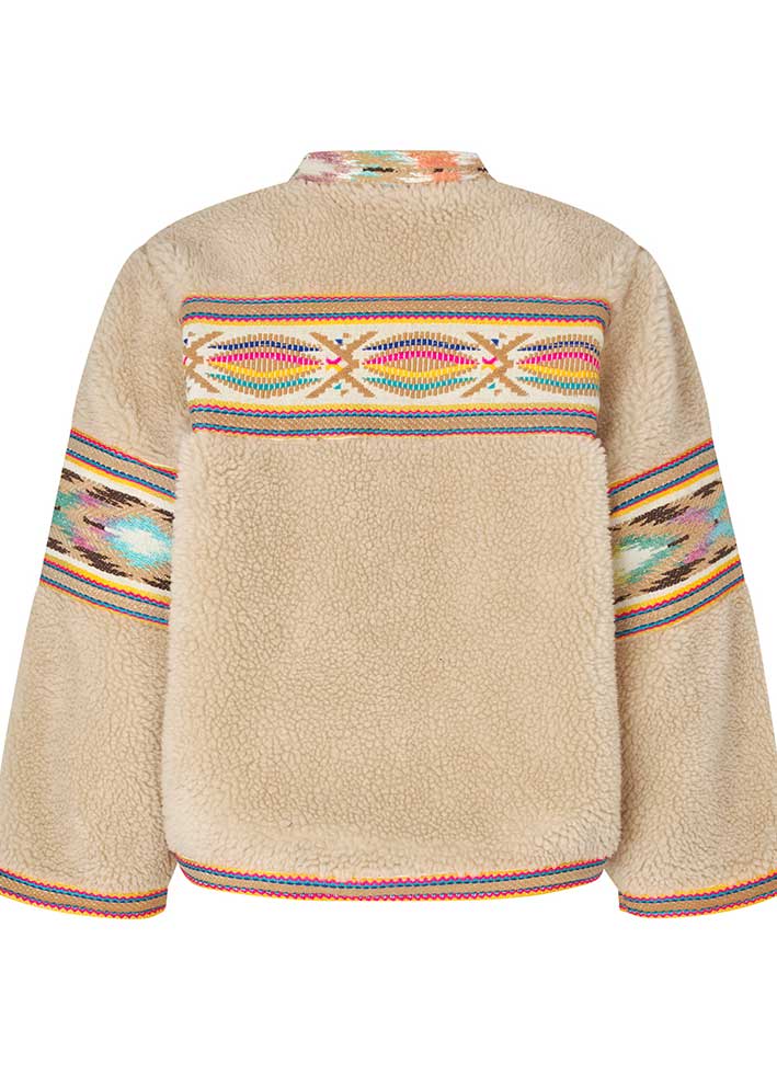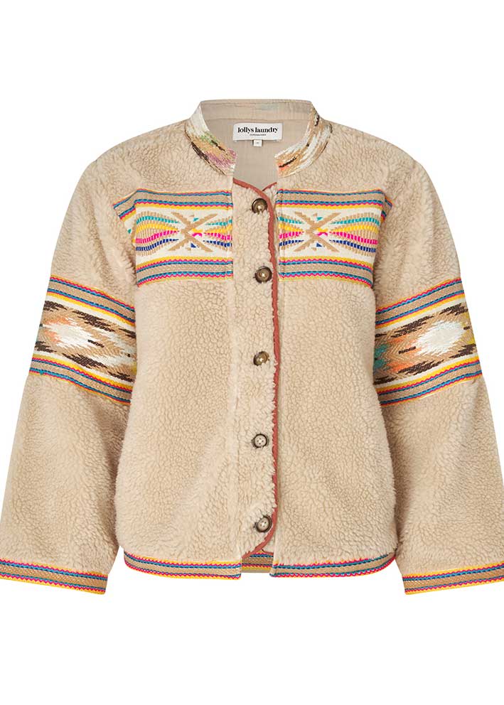 Total skøn beigefarvet Siri teddy jakke fra Lollys Laundry, designet i et boxy snit med lange ærmer, knapper ned foran. Jakken har et lækkert fluffy look og de smukkeste multifarvede vævede detaljer, der understreger det unikke udtryk.
