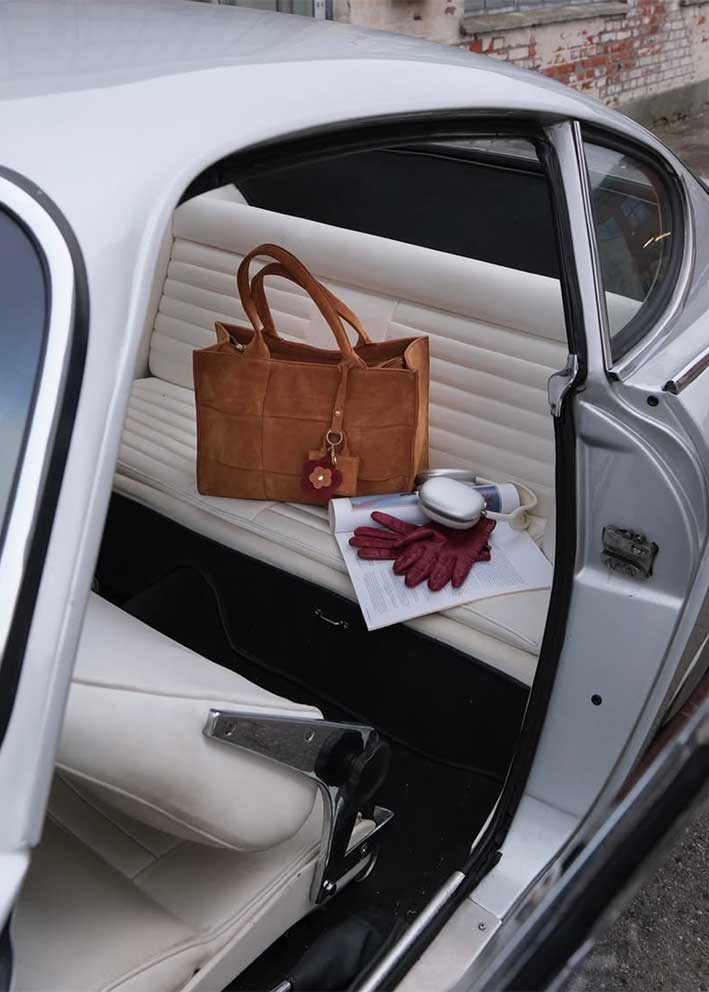 Umådelig sød og lækker camelfarvet Cervino Vista Charm i ruskind fra Luna Moon. Charm-tasken er designet i et firkantet snit med flet-effekt og lukkes med trykknap.