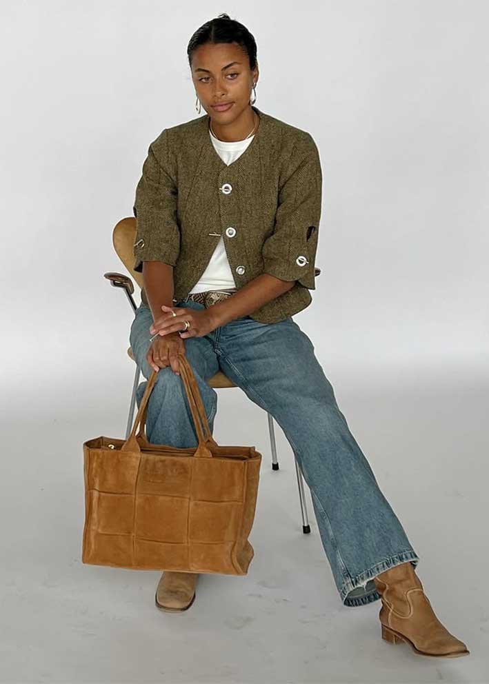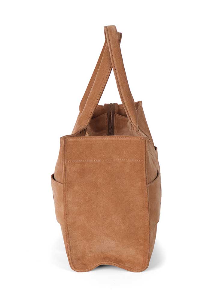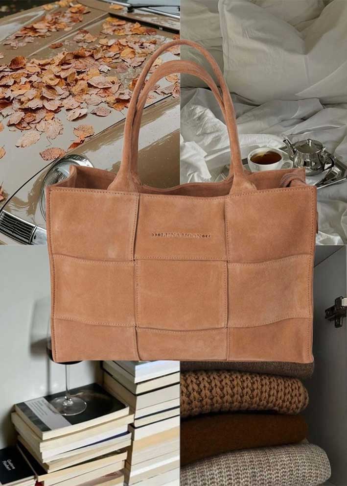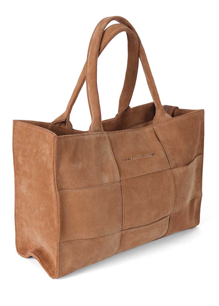 Umådelig lækker camelfarvet Cervino Vista mellemstor ruskindstaske fra Luna Moon. Tasken er designet i et klassisk firkantet snit med flet-effekt og to hanke og lukkes med lynlås. Desuden foret og udstyret indvendigt med 3 lommer, hvoraf den ene lukkes med lynlås.