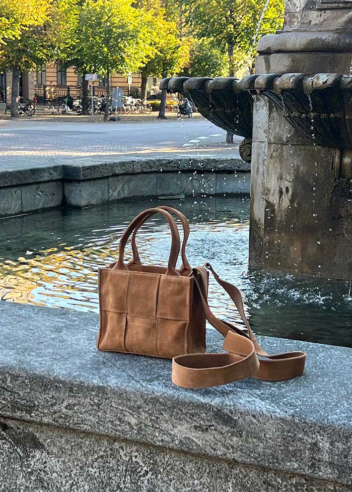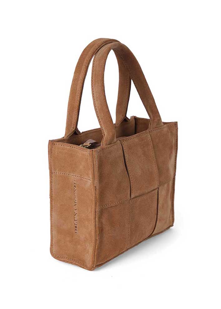 Umådelig sød og lækker camelfarvet Cervino Vista Mini ruskindstaske fra Luna Moon. Tasken er designet i et klassisk firkantet snit med flet-effekt og to hanke og lukkes med lynlås. Desuden foret og udstyret indvendigt med en lomme.